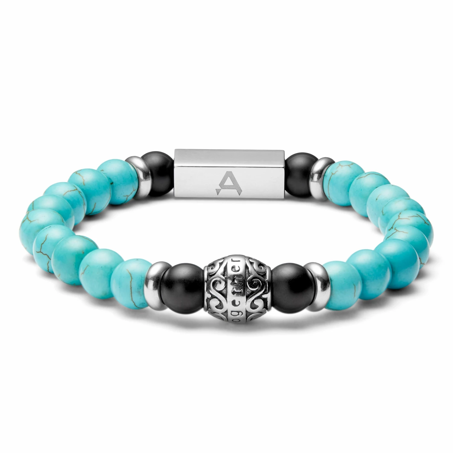 Taking inspiration from crystal clear beaches and blue skies, this bracelet showcases black Onyx and Blue Turquoise beads with matching silver-tone steel accents.