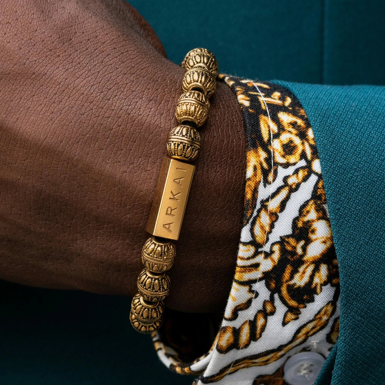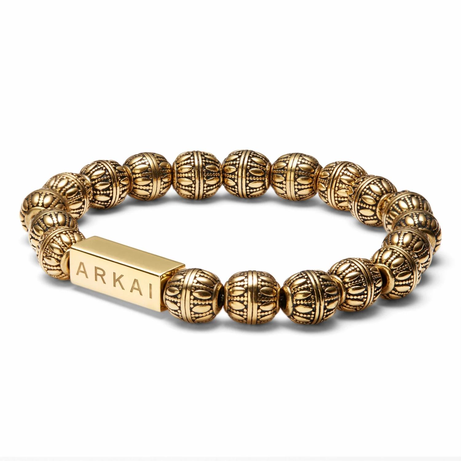 Intricate detail on the beads gives it a well-traveled vibe. Can be worn alone or with smaller bracelets in a stack.