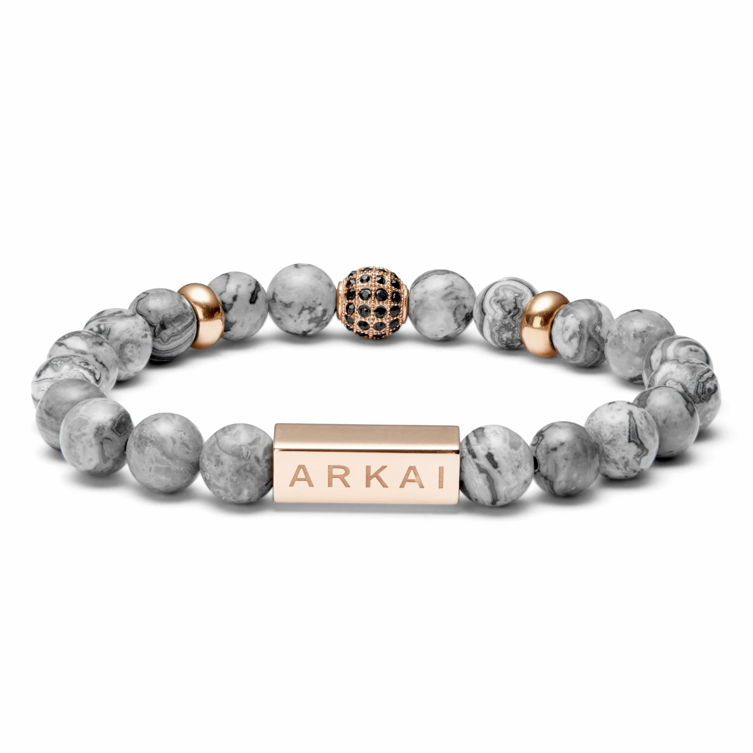 Each Jasper stone bead is an intricate blend of grey, black and white. Highlighted by rose-gold and gold-toned stainless steel accents, this bracelet looks brilliant solo or stacked.