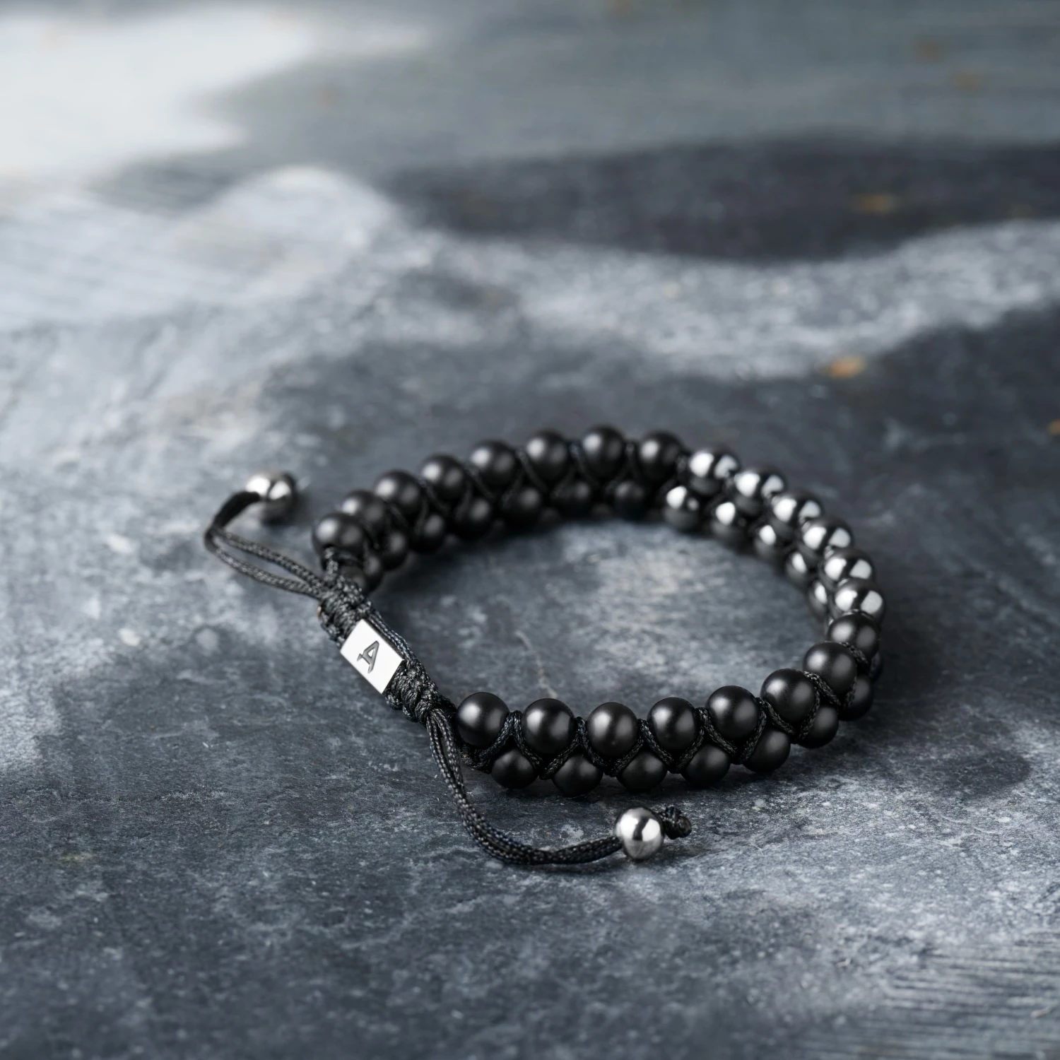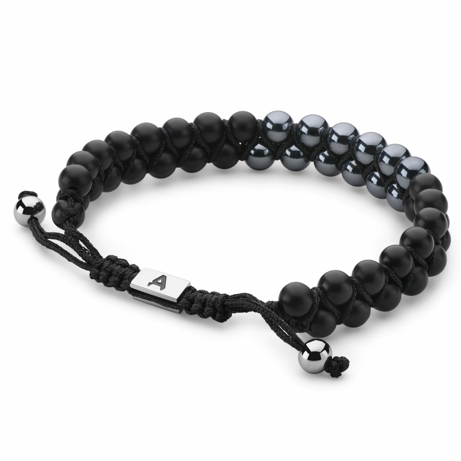 These rows of hematite and onyx beads are woven onto strong nylon threads, and the surrounding weave gives it a leather-like stiffness. The bracelet is closed by a braided lock featuring the Arkai logo.