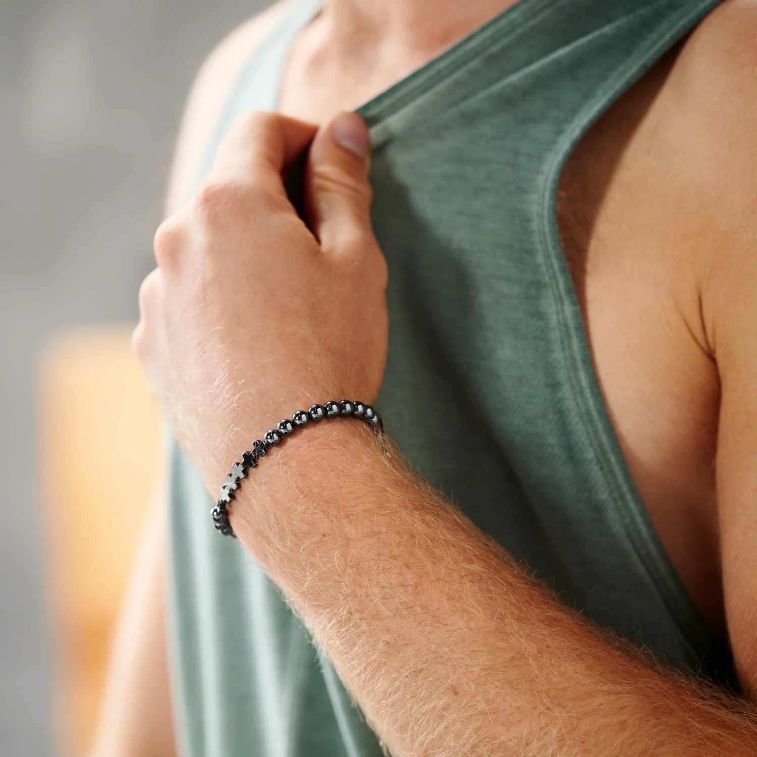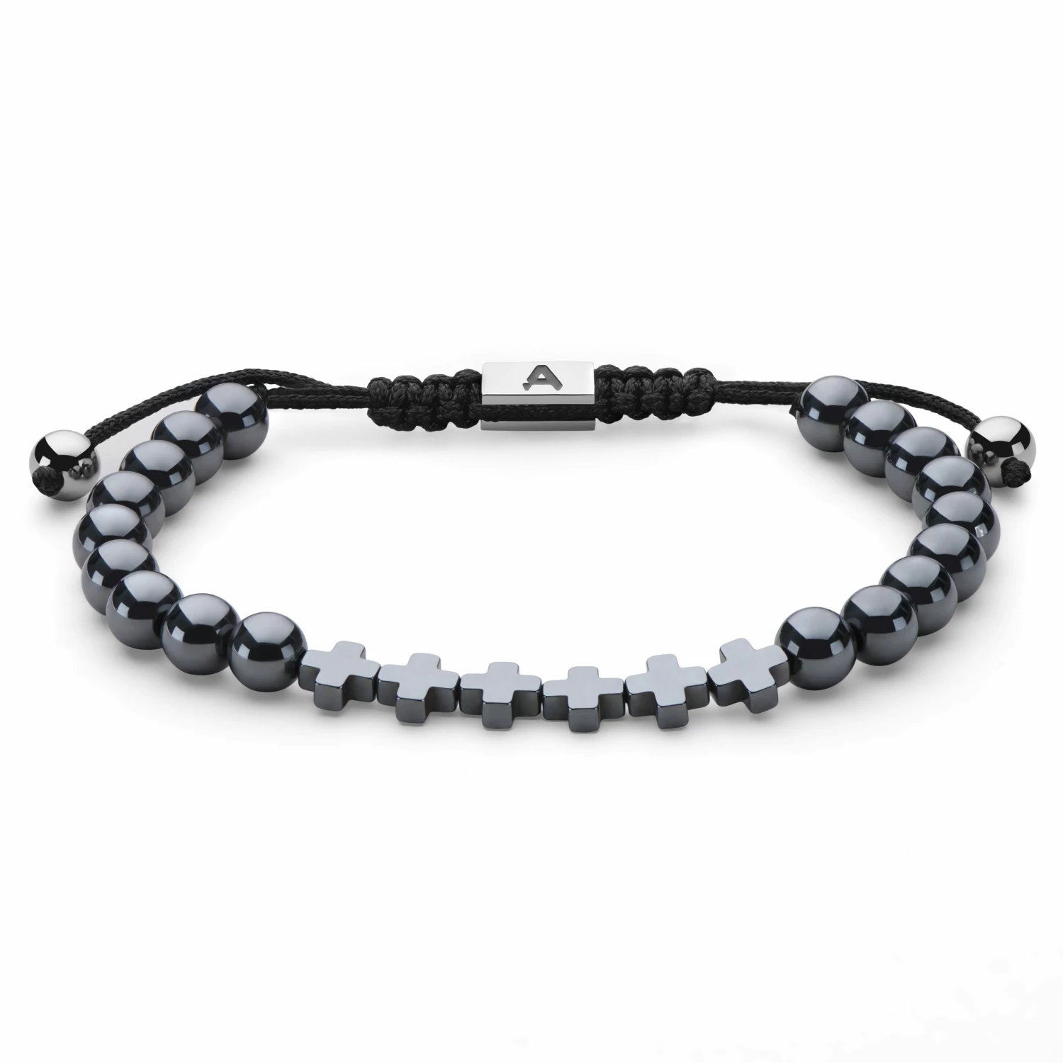 This men’s bracelet features weighty 6 mm beads threaded on a strong nylon cord, complete with a braided lock engraved with the Arkai logo.
