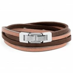 Lucleon Light Brown Leather & Stainless Steel Double Wrap Bracelet