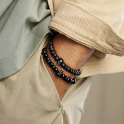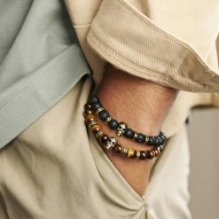 Arkai Rico | Gold-Tone Lava Rock & Tiger’s Eye Skull Bracelet Set