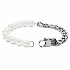 Lucleon Amager | Silver-Tone Stainless Steel Curb Chain & Pearl Bracelet