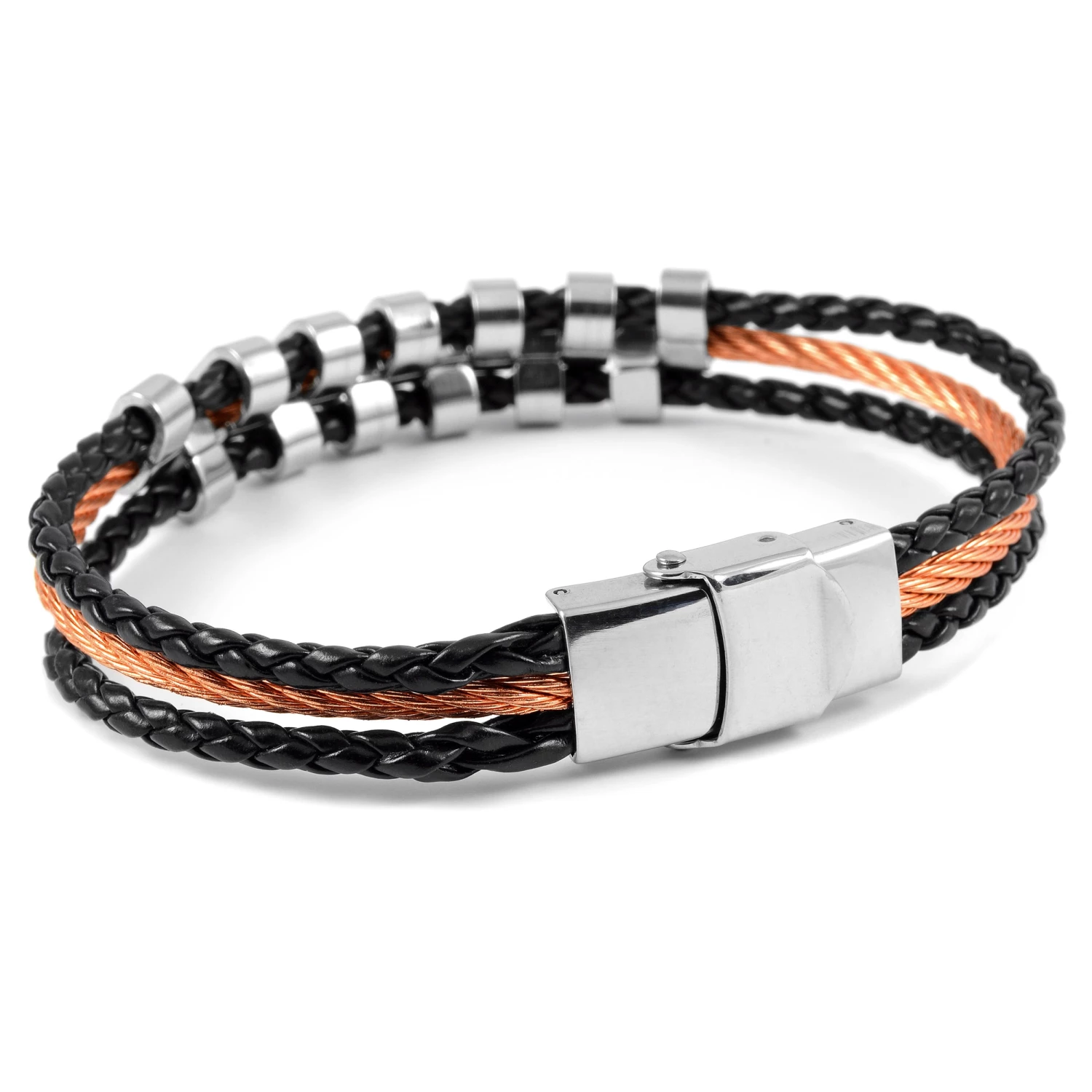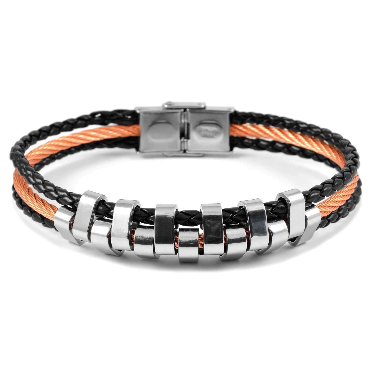Its distinctive design consists of two black leather Bolo braided ropes and an orange braided wire.