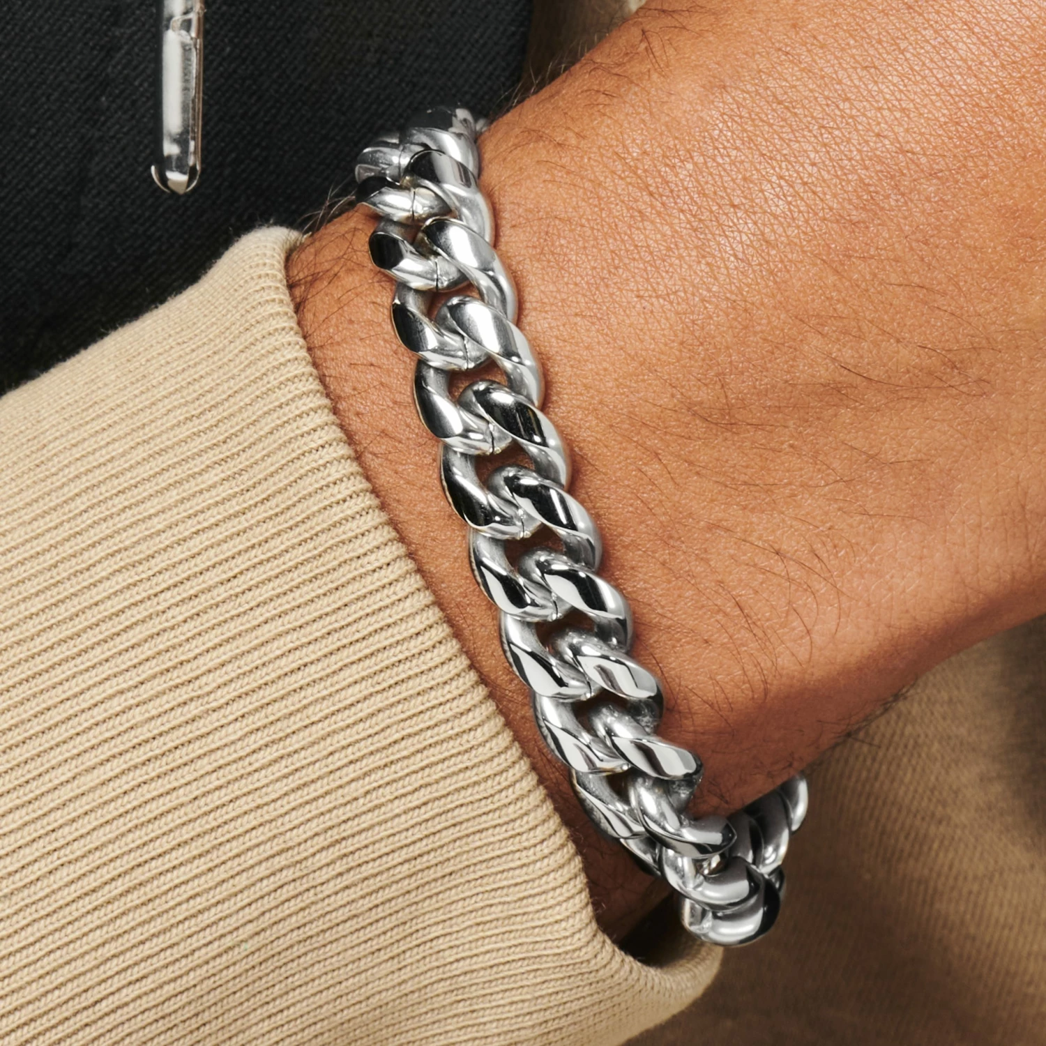 Neutral in color but not subtle, this men’s curb chain bracelet adds eye-catching style to any ordinary wrist.