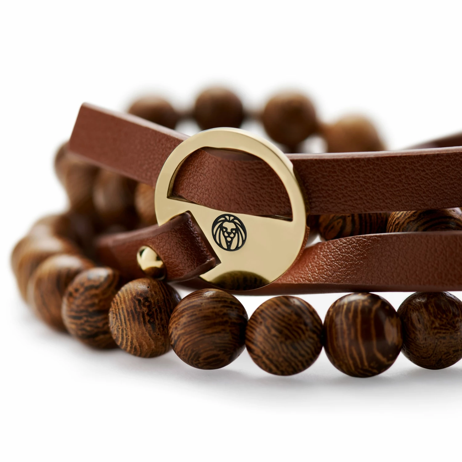 This duo of men’s bracelets is made of genuine leather, natural Jichimu wood beads, and surgical-grade stainless steel elements.