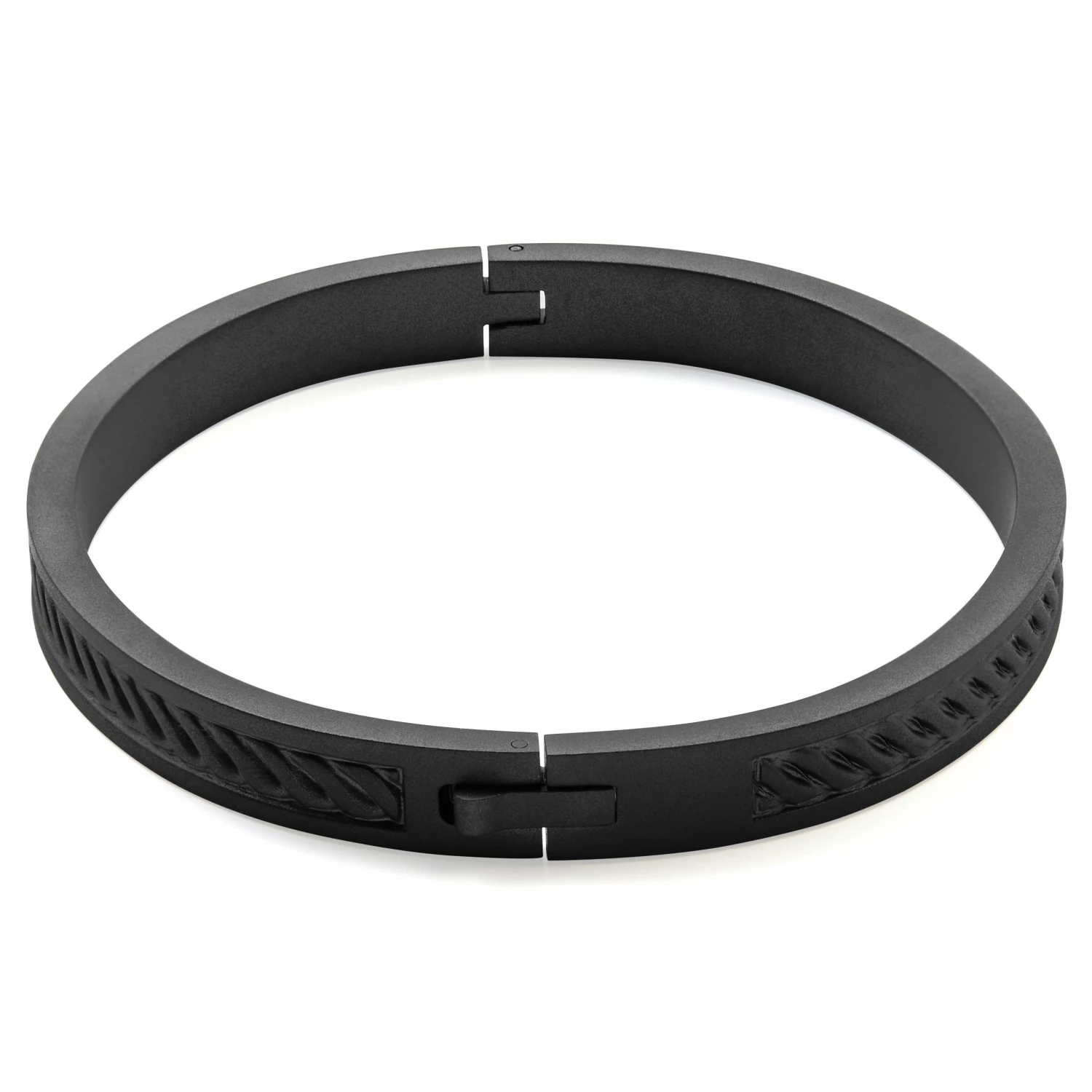 A solid, matte black hinge bangle bracelet with a rope texture etched onto its surface. Most bracelets follow the curves of your wrist, but this bad boy does his own thing.