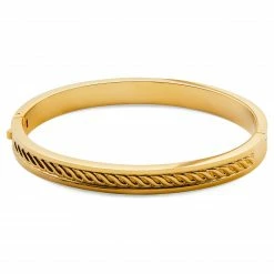 This hinged men’s bangle bracelet cuff is made of surgical-grade stainless steel and coated gold tone for an elegant masculine look. Locks with a strong, easy-to-use clasp that makes accidental opening almost impossible.
