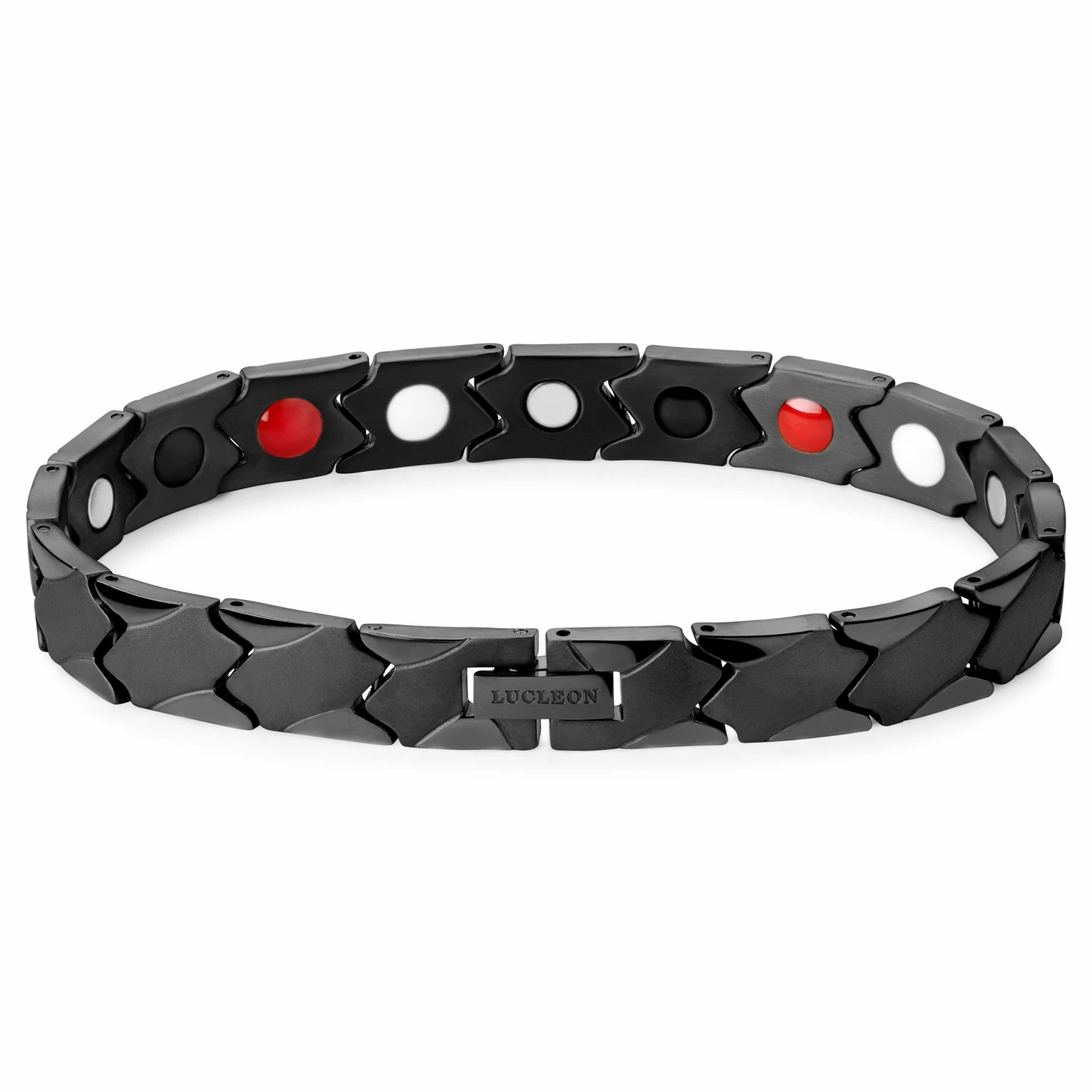 This men’s bracelet for men comes with just enough interesting detail to make it the perfect accessory. Along the edge of the bracelet, polished black provides a striking contrast to the matte black core. The inside is inlaid with negative ion, germanium, far-infrared (FIR) and gauss magnets.