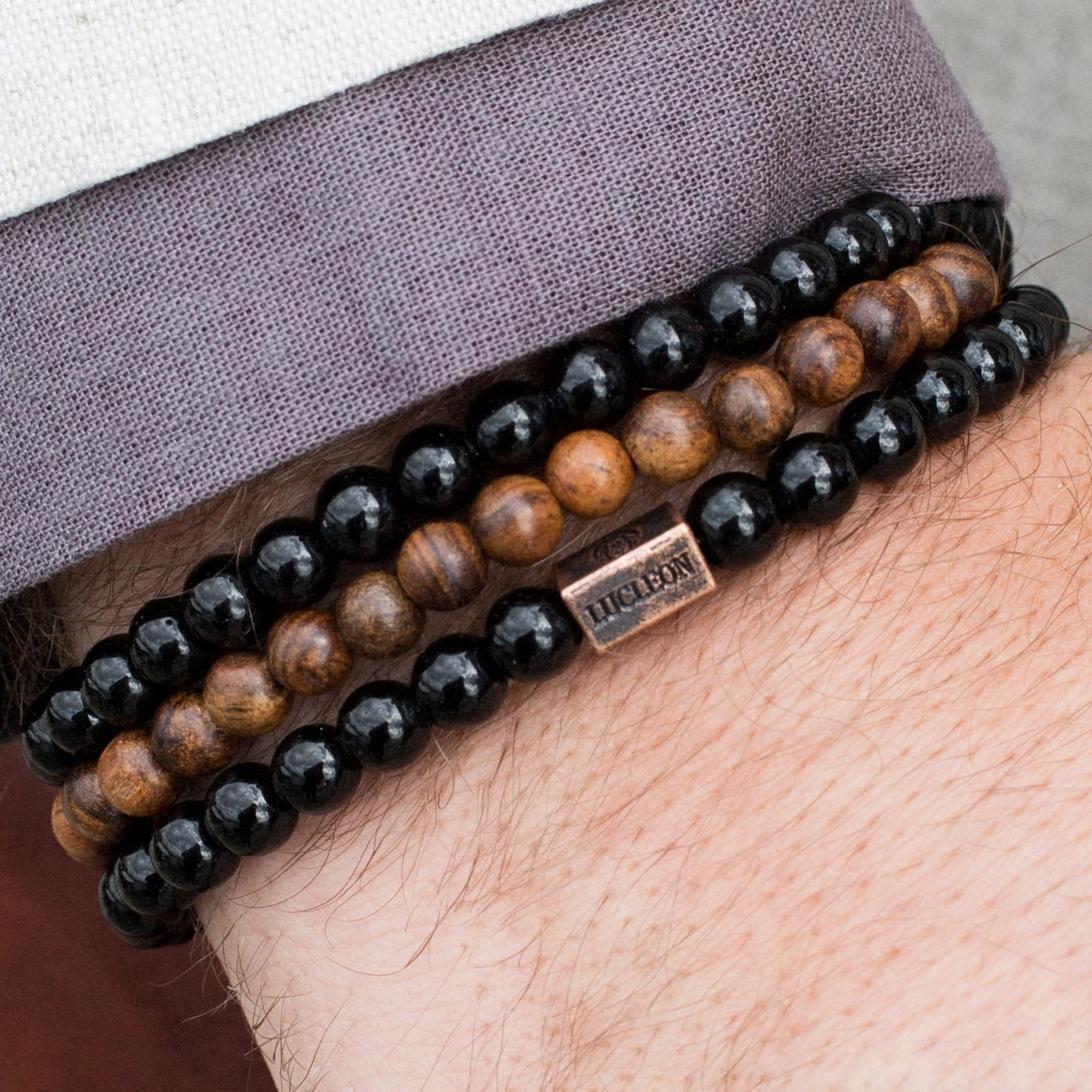 This bracelet trio comes to you from the Danish brand Lucleon. Features 2 black Adamas stone bracelets and 1 brown wooden bead bracelet. Wear them individually or all together. Pair them with casual or formal ensembles for a cool, edgy look.