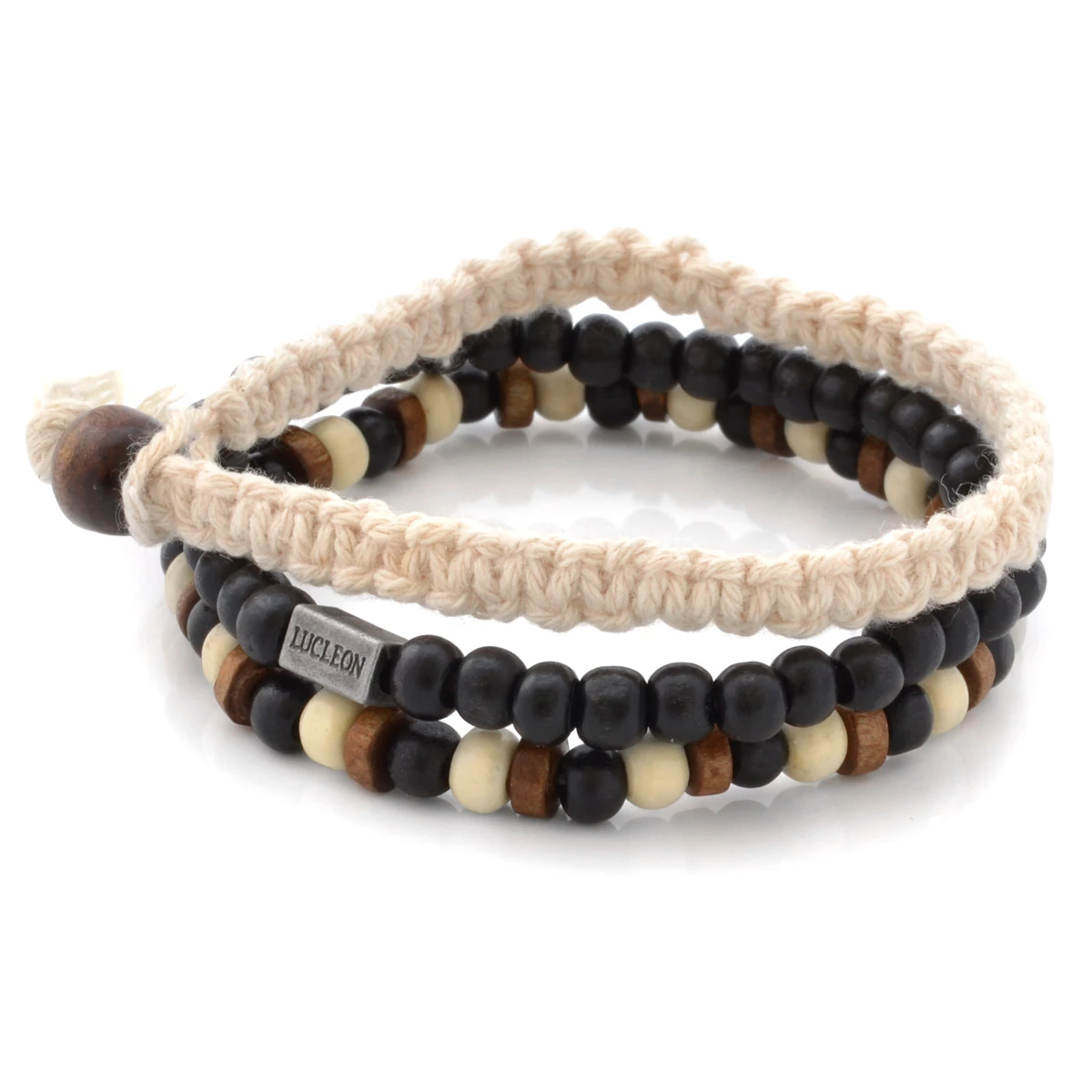 Two bracelets feature wooden beads, while the third is crafted from cotton cord.
