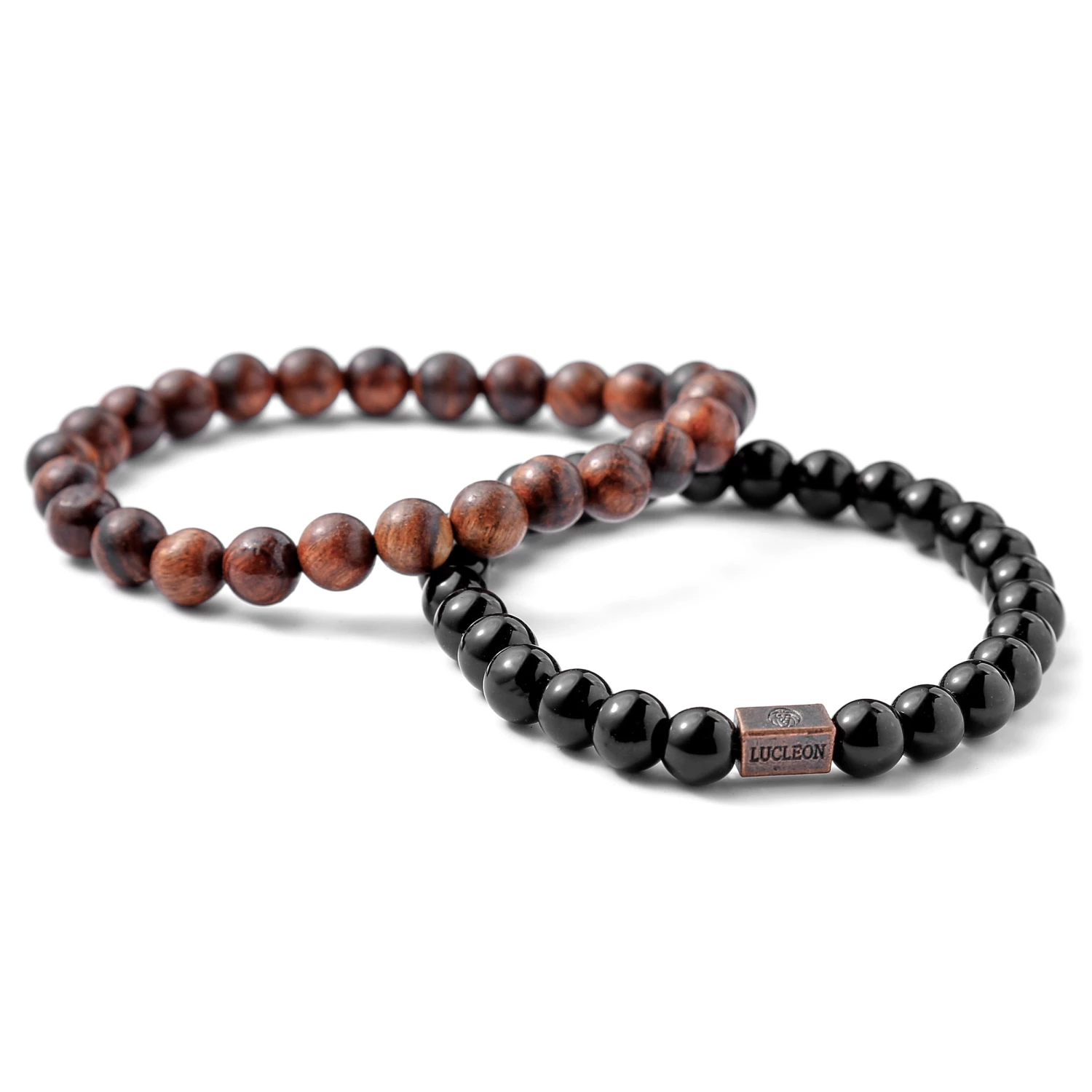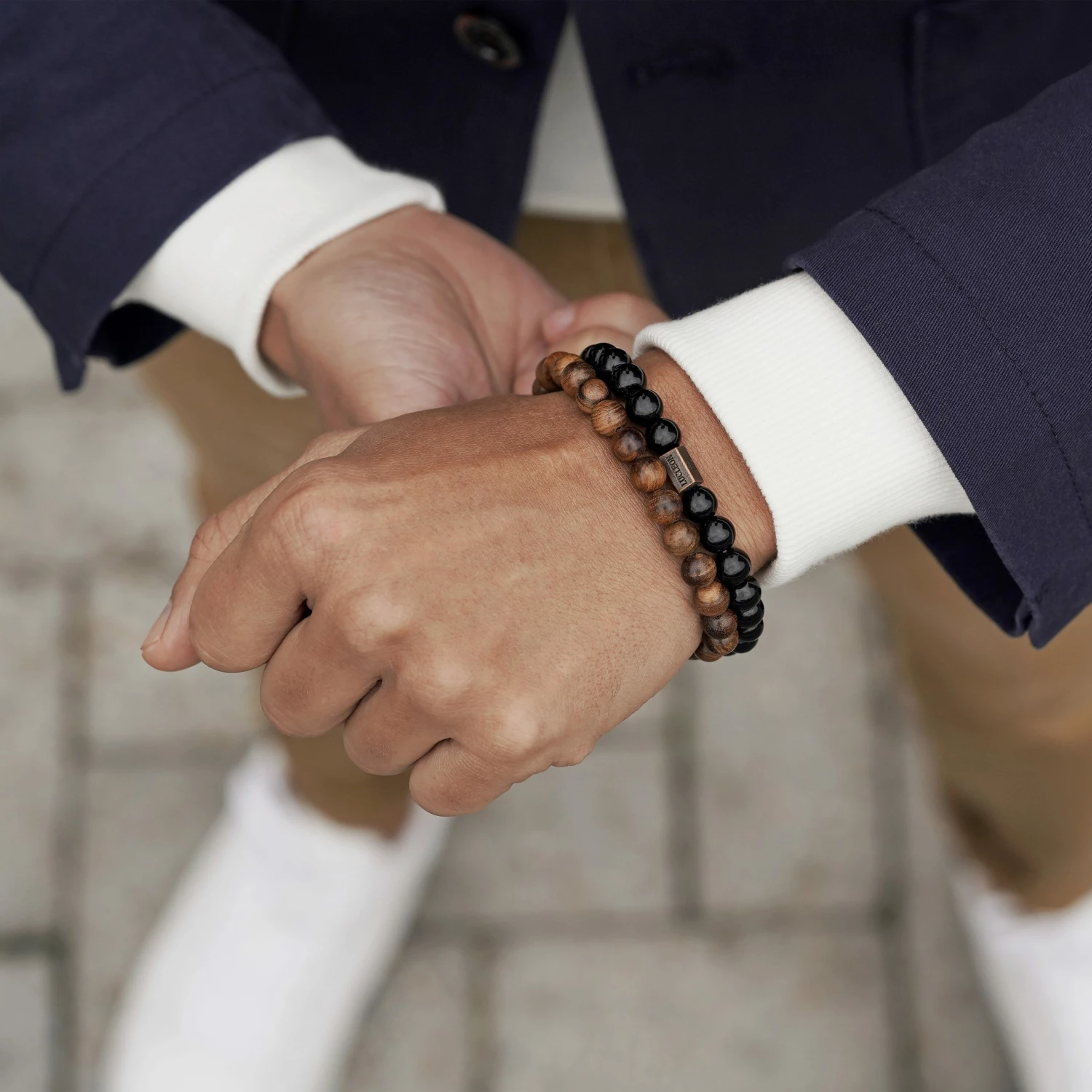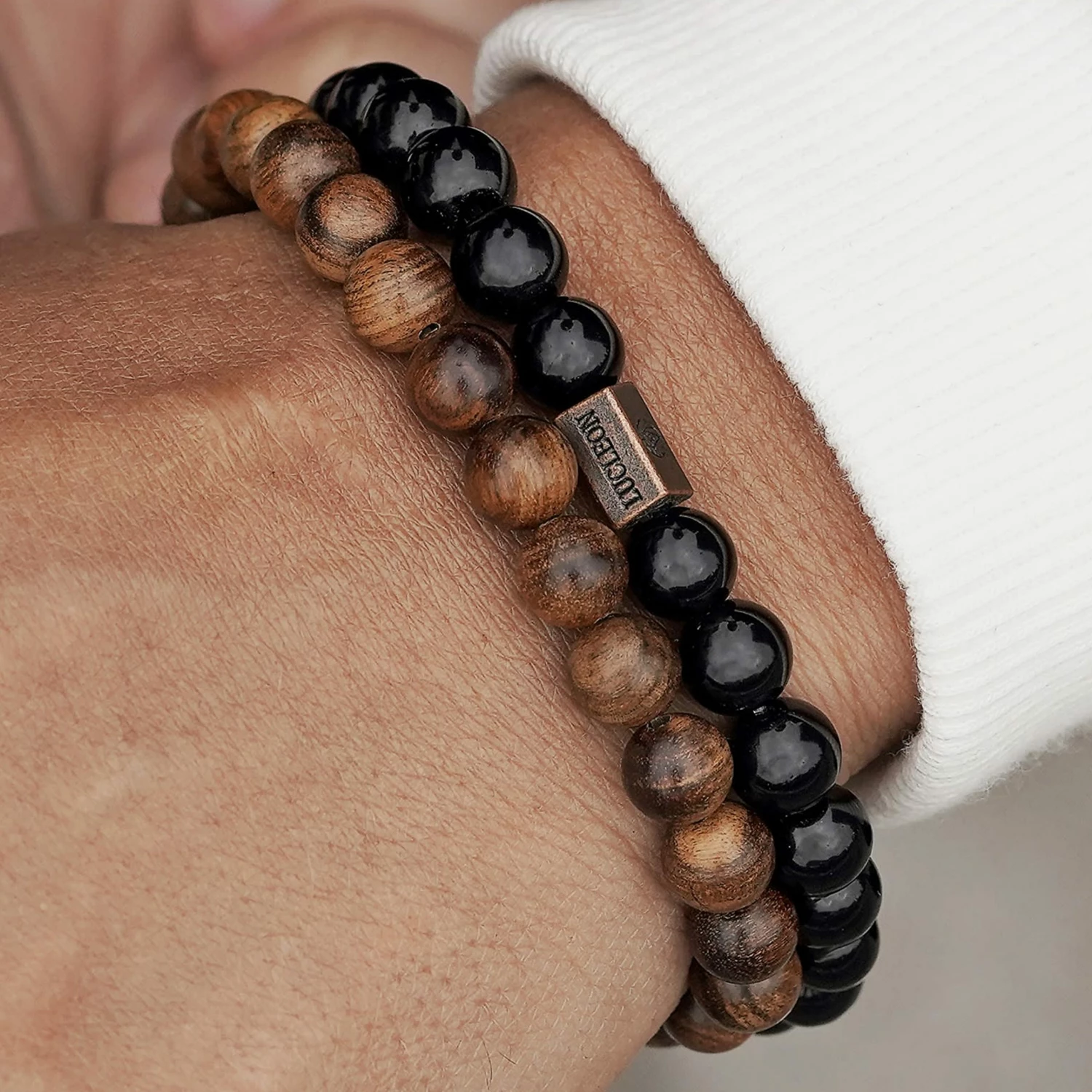 This pear tree wood and Adamas stone bracelet duo features a neutral color scheme. Looks great with any casual look. Wear separately or as a pair.