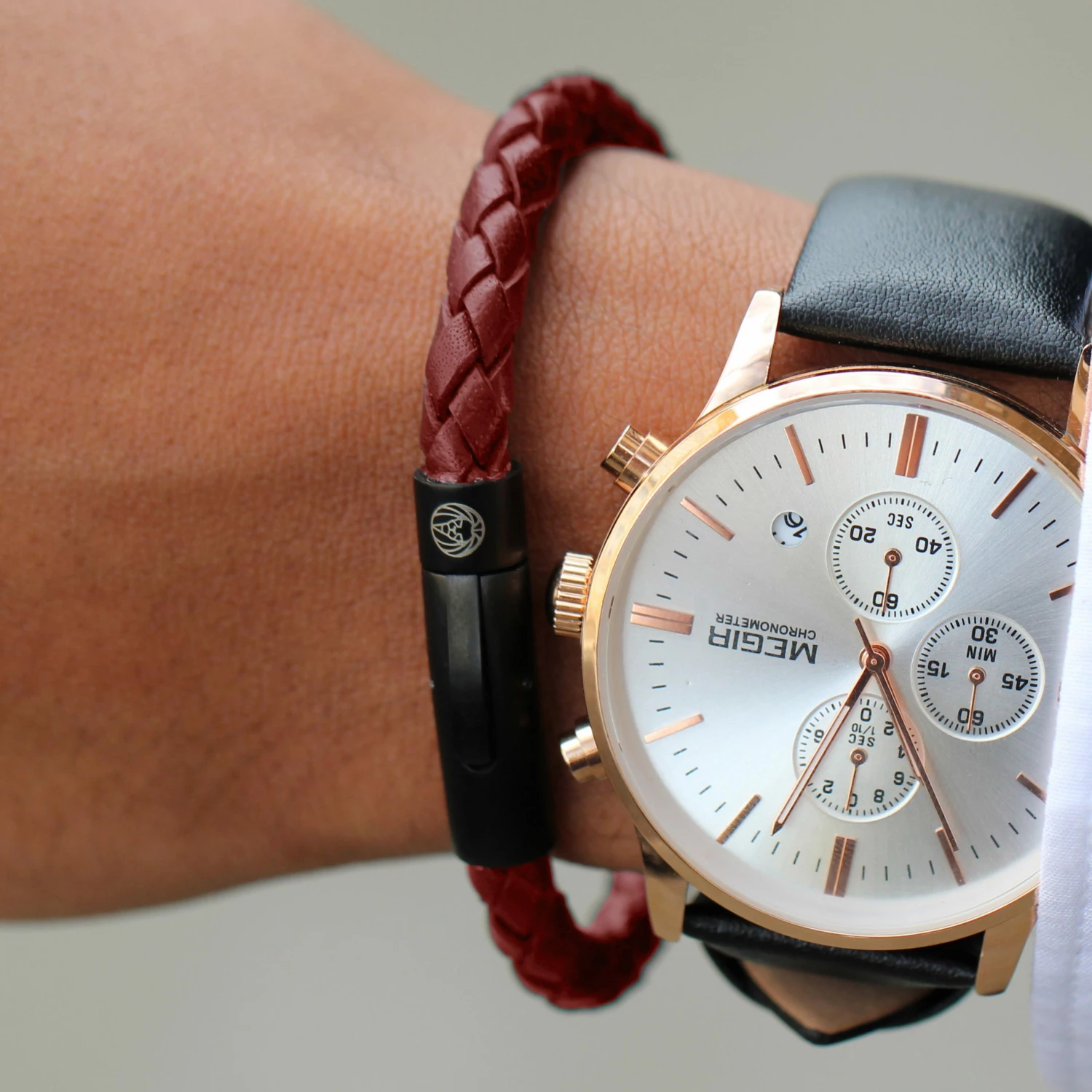 This braided leather bracelet has two things in common with a bottle of dark red wine – its color, and the fact that it gets better with time. High-quality never goes out of style, and when you combine it with a timeless modern stainless steel lock, you get a statement accessory.