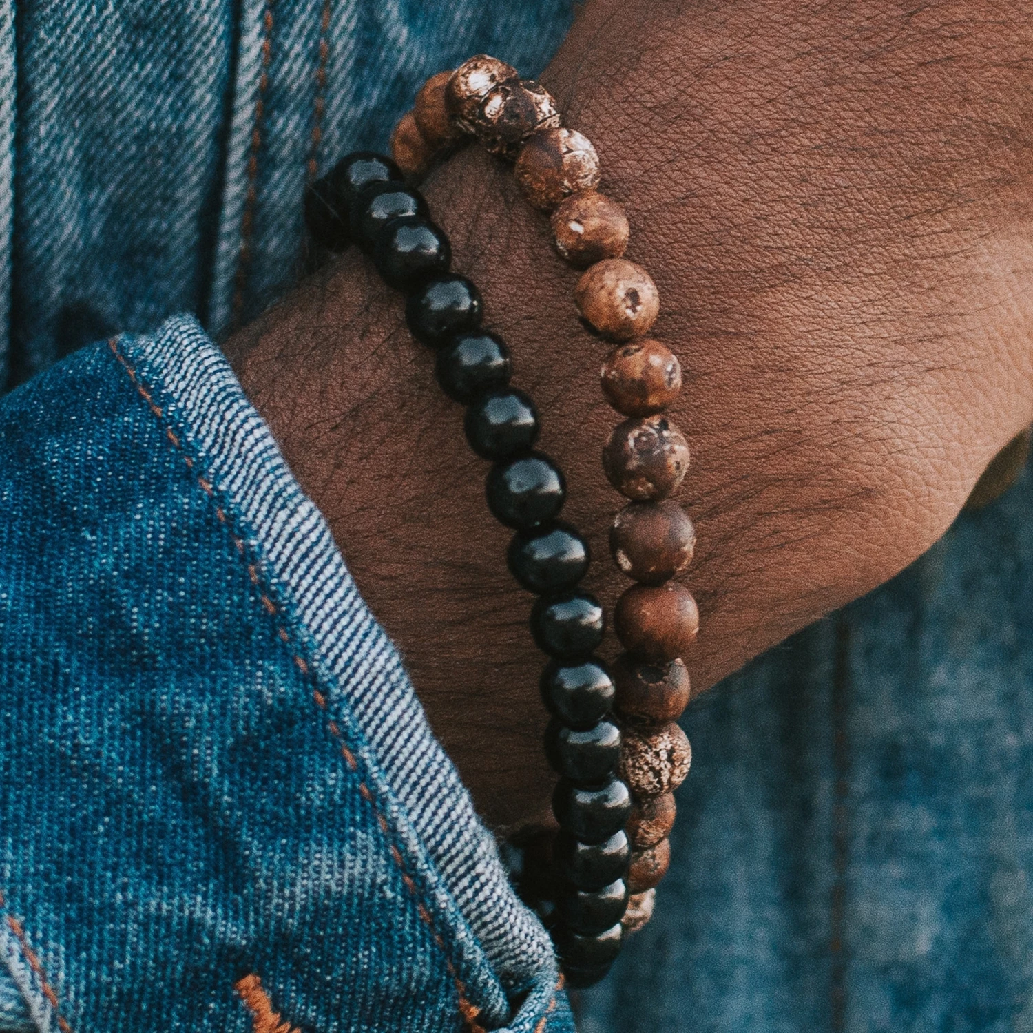 Another gorgeous offering from the Danish brand Lucleon. This pair of beaded bracelets is part of the Miro collection. Features earthy brown agate and matte black wood beads. One signature metal bead is included.