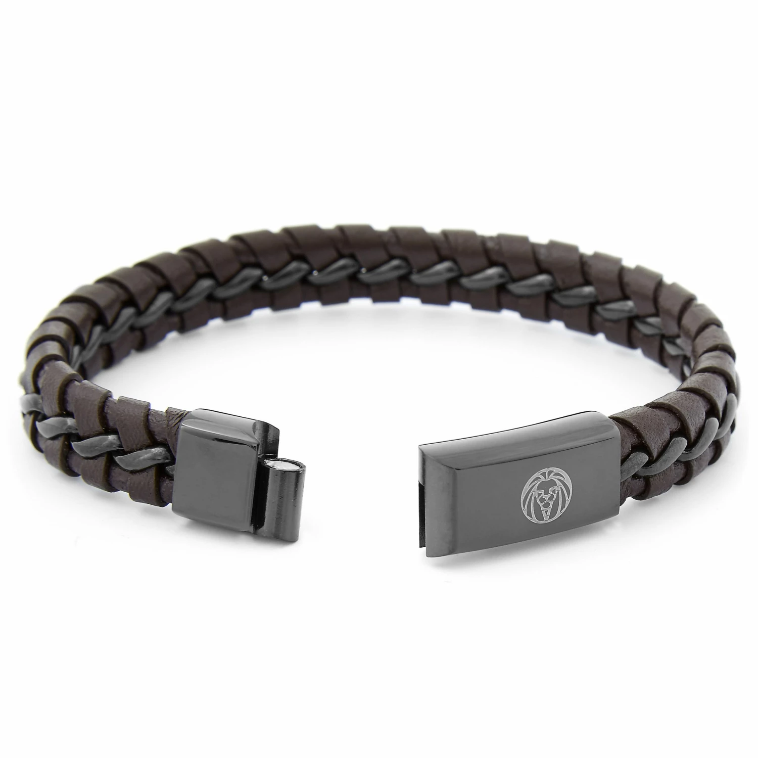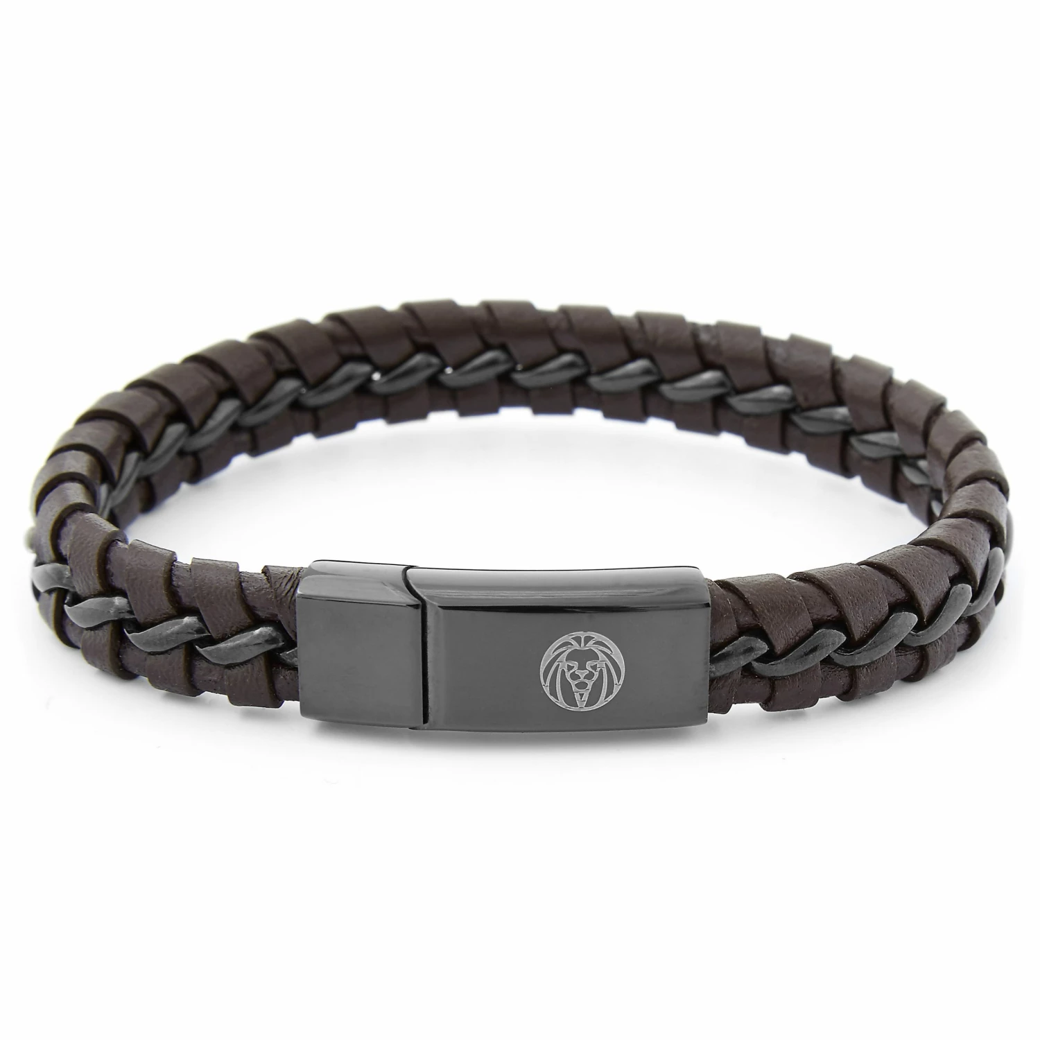 This top-grade genuine leather bracelet in brown is a classic, with a single strip of black leather woven through the middle for a striking contrast. The polished black stainless steel clasp features an inbuilt magnetic lock to keep your bracelet on all day long.