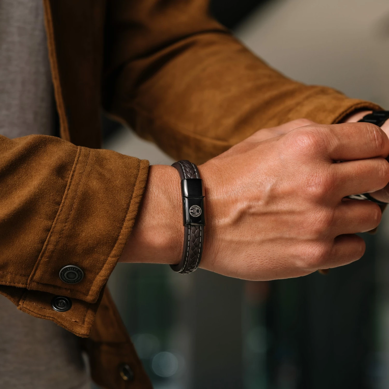 Features a braided strip running through the center and elegant white stitching around the border. The black stainless steel clasp includes a magnetic lock to keep your bracelet securely fastened.