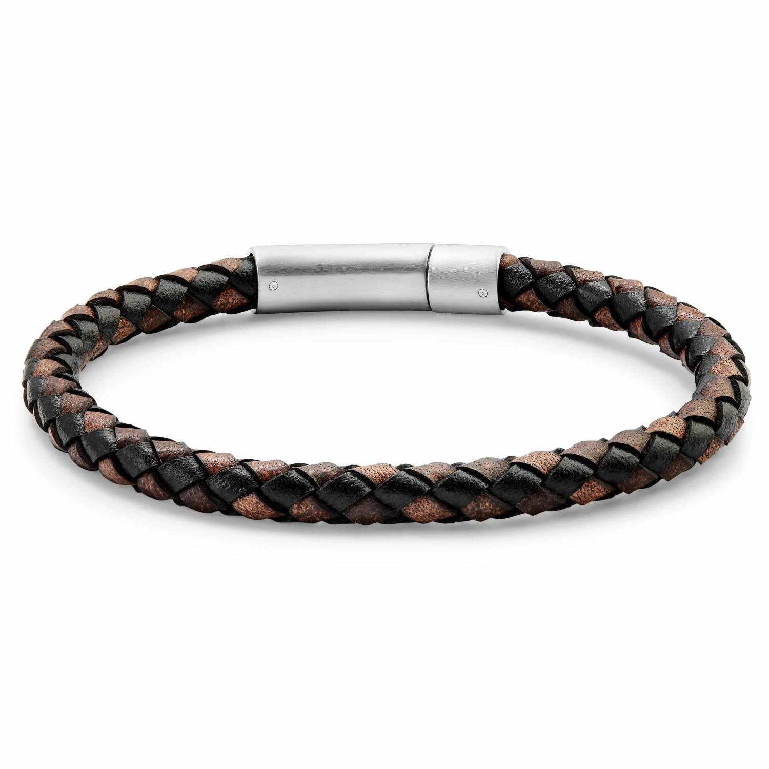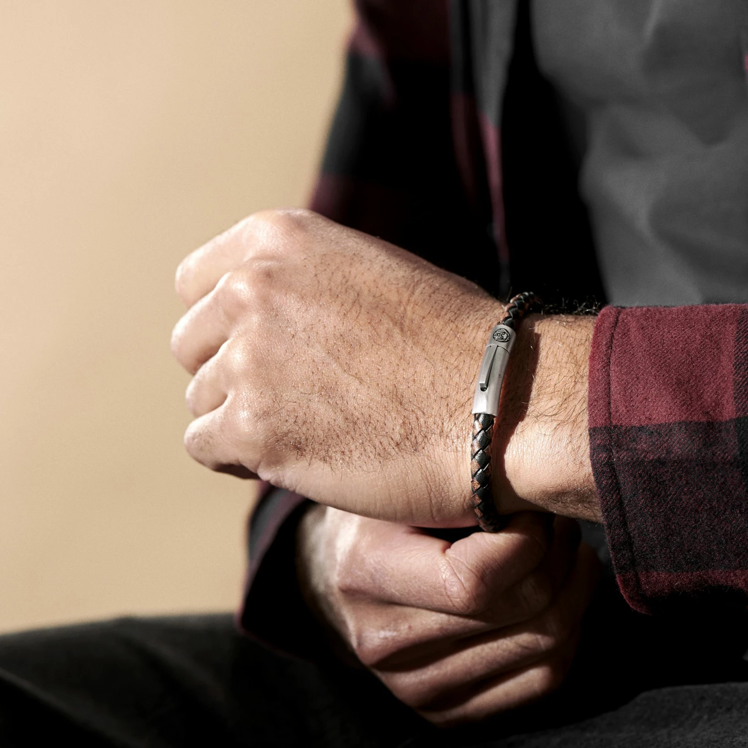 A checkered pattern of two genuine leather strands. This bolo weave men’s bracelet elegantly mixes black and vintage brown for a bracelet that’ll go with anything.