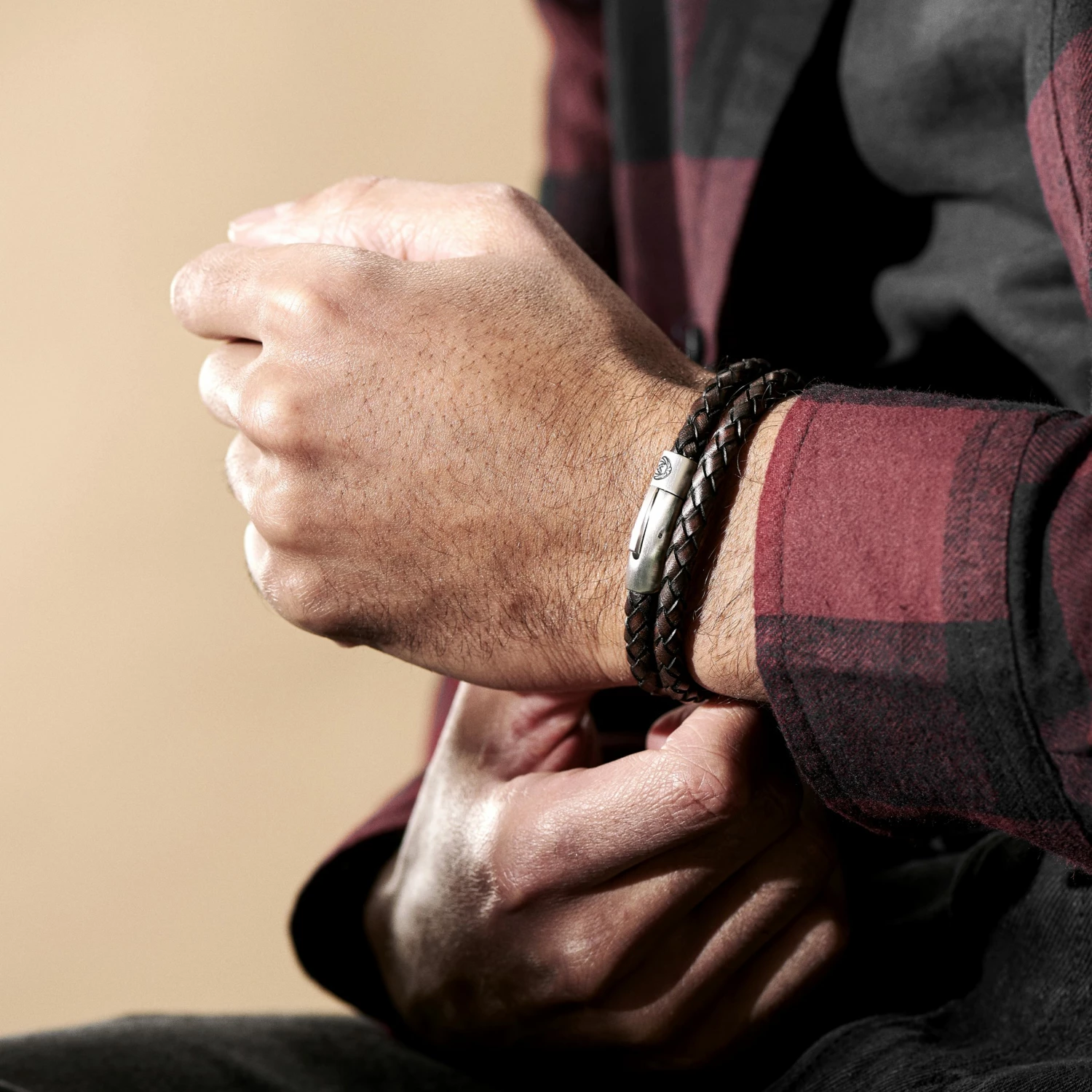 Strong statement – simple design. This bolo weave men’s bracelet is unmistakable around your wrist but will make an even stronger statement worn as a choker.