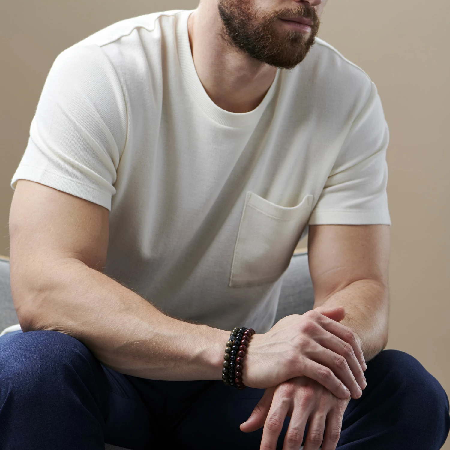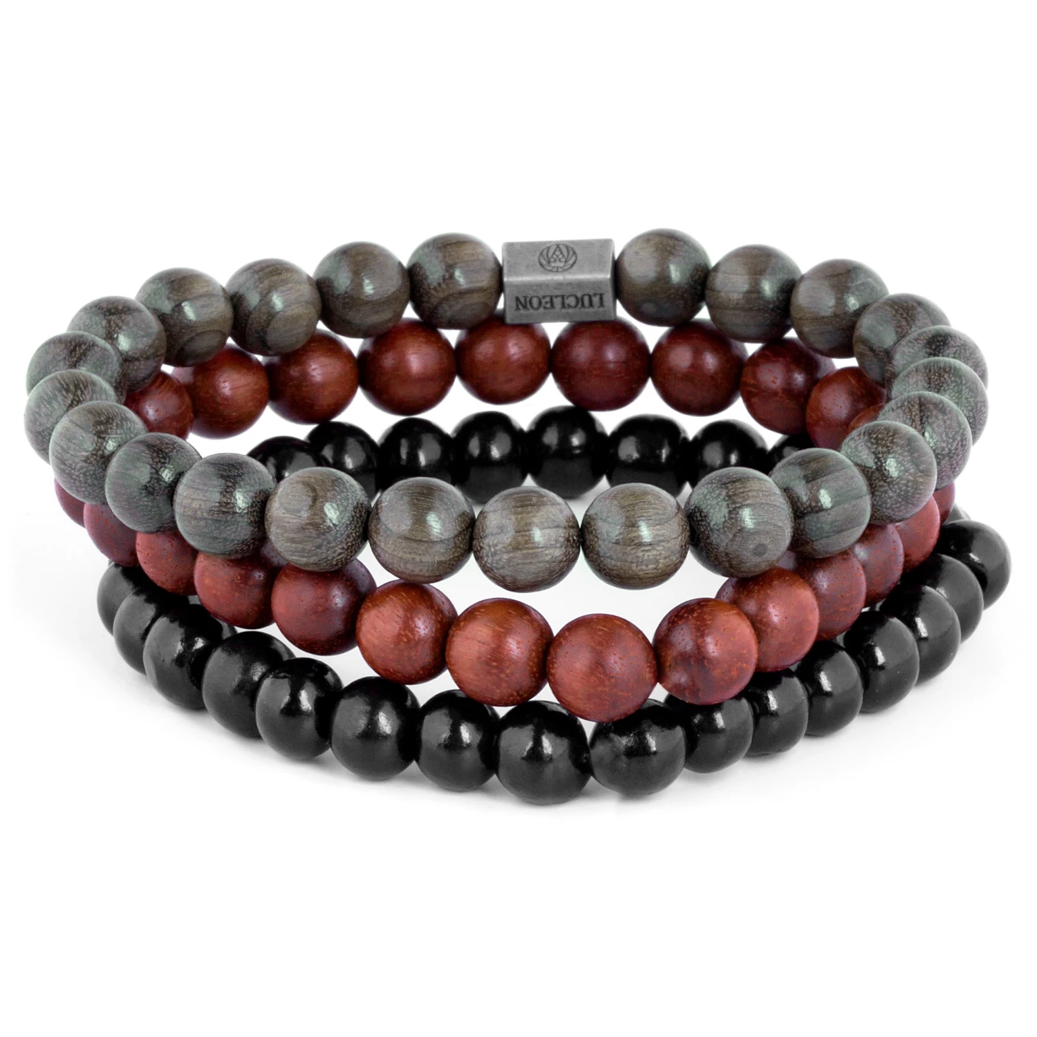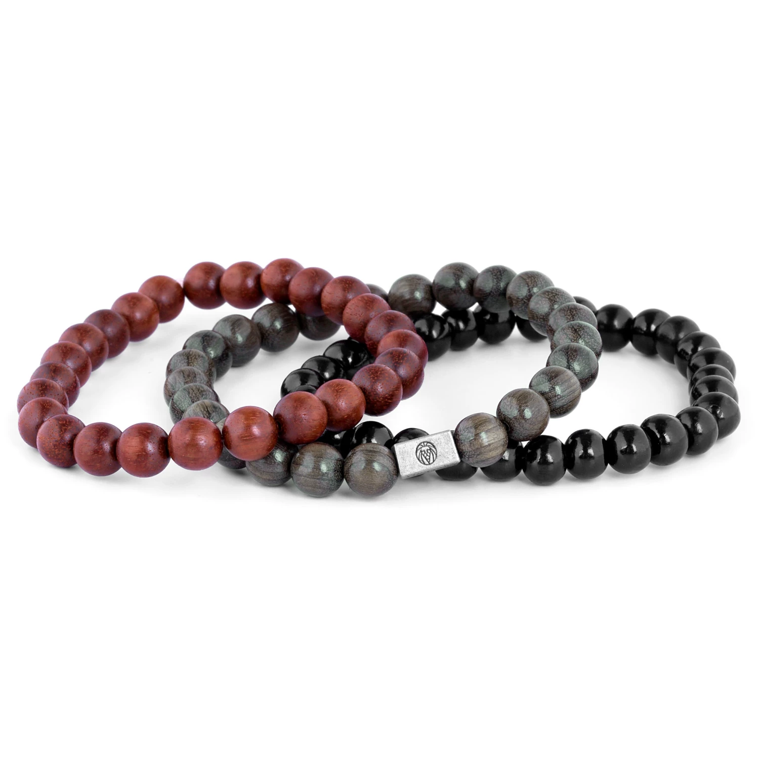A variety of wood types and earthy colors are strung on sturdy silicone bands. Black, gray, and red wooden beads, along with 1 signature metal bead, coordinate beautifully together.