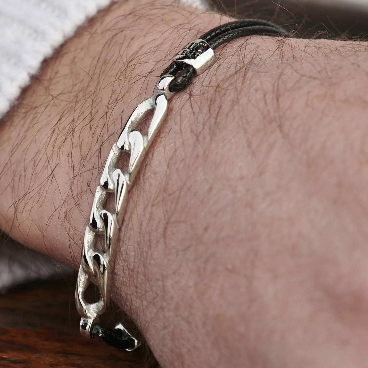 This slender men’s bracelet features rigid chain links combined with flexible braided cord.
