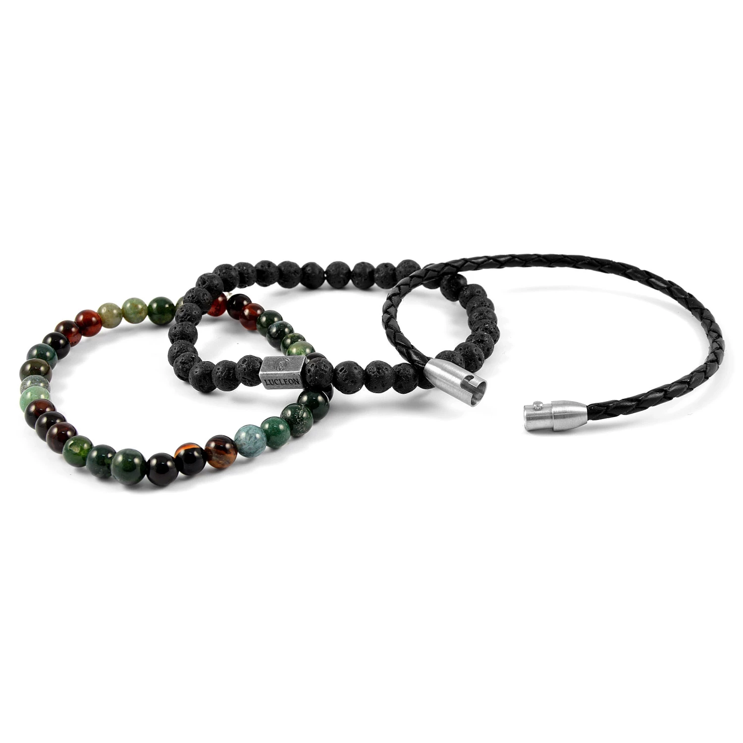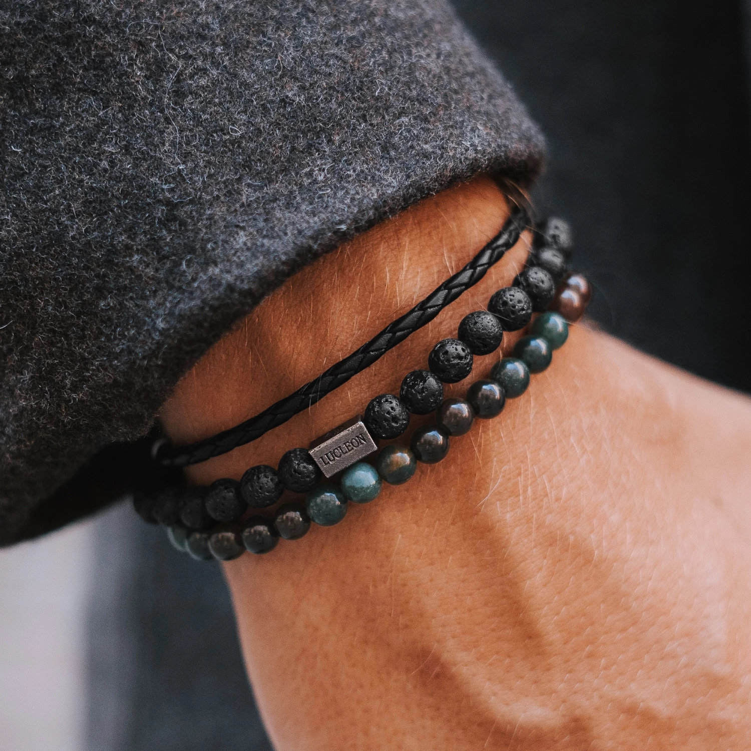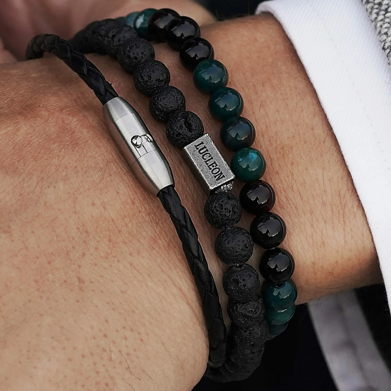 The first bracelet features 100% black lava beads with a small metal Lucleon pendant right in the center.