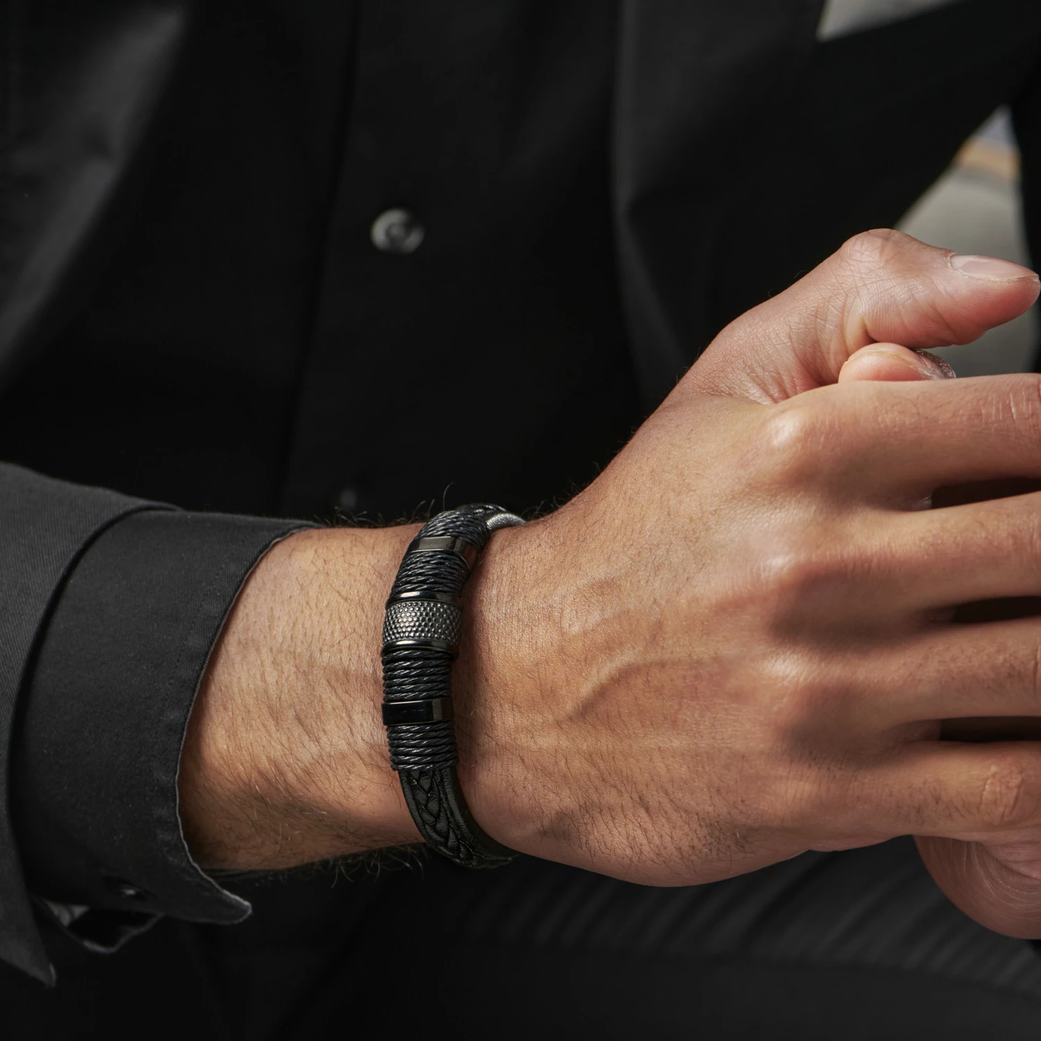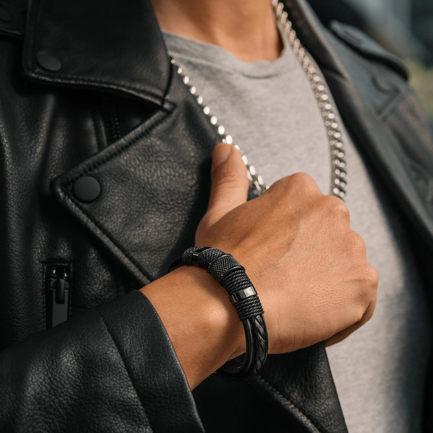 Features an all-black leather band inlaid with a leather braid. Black stainless steel accents and wrapped cord complete the look with edgy style.