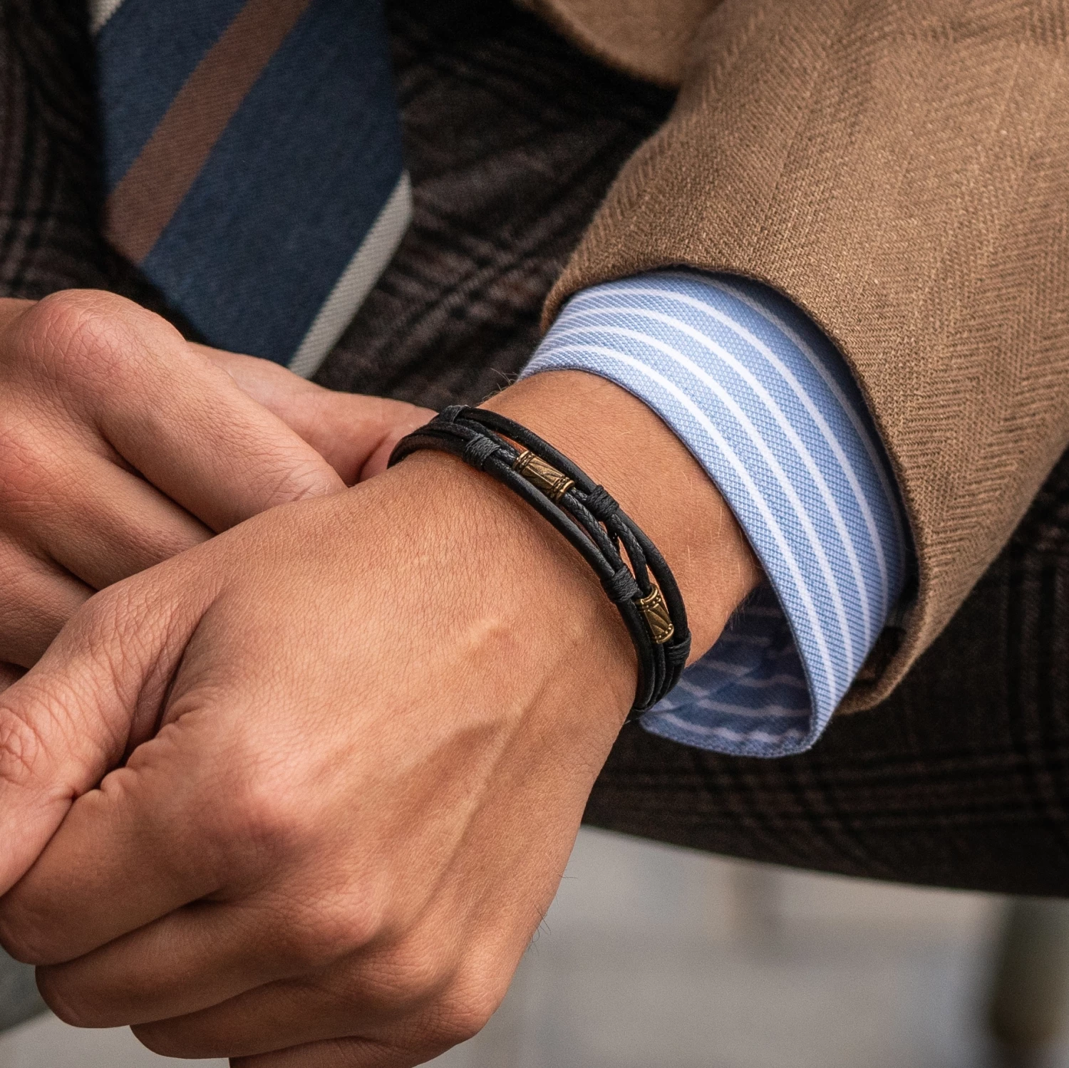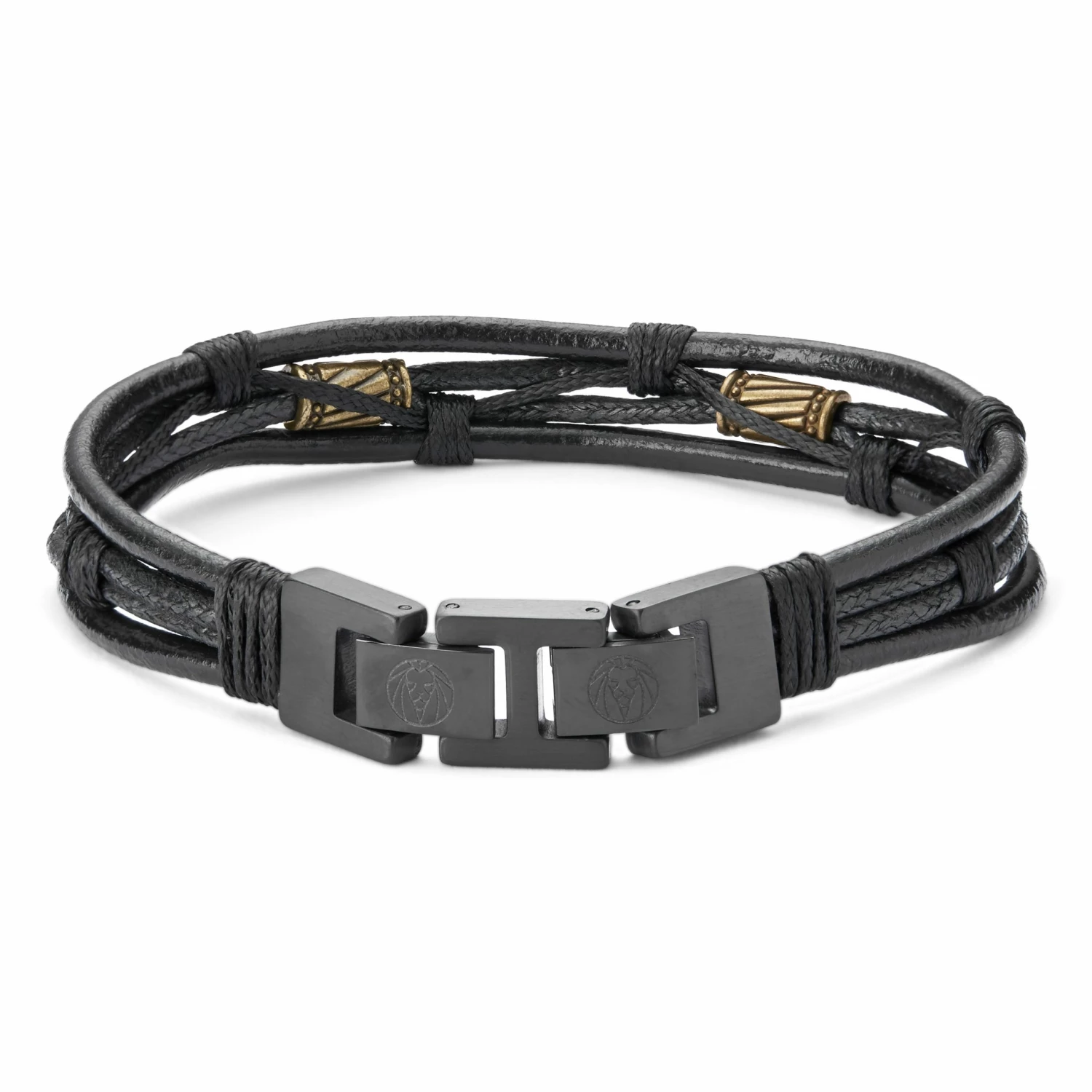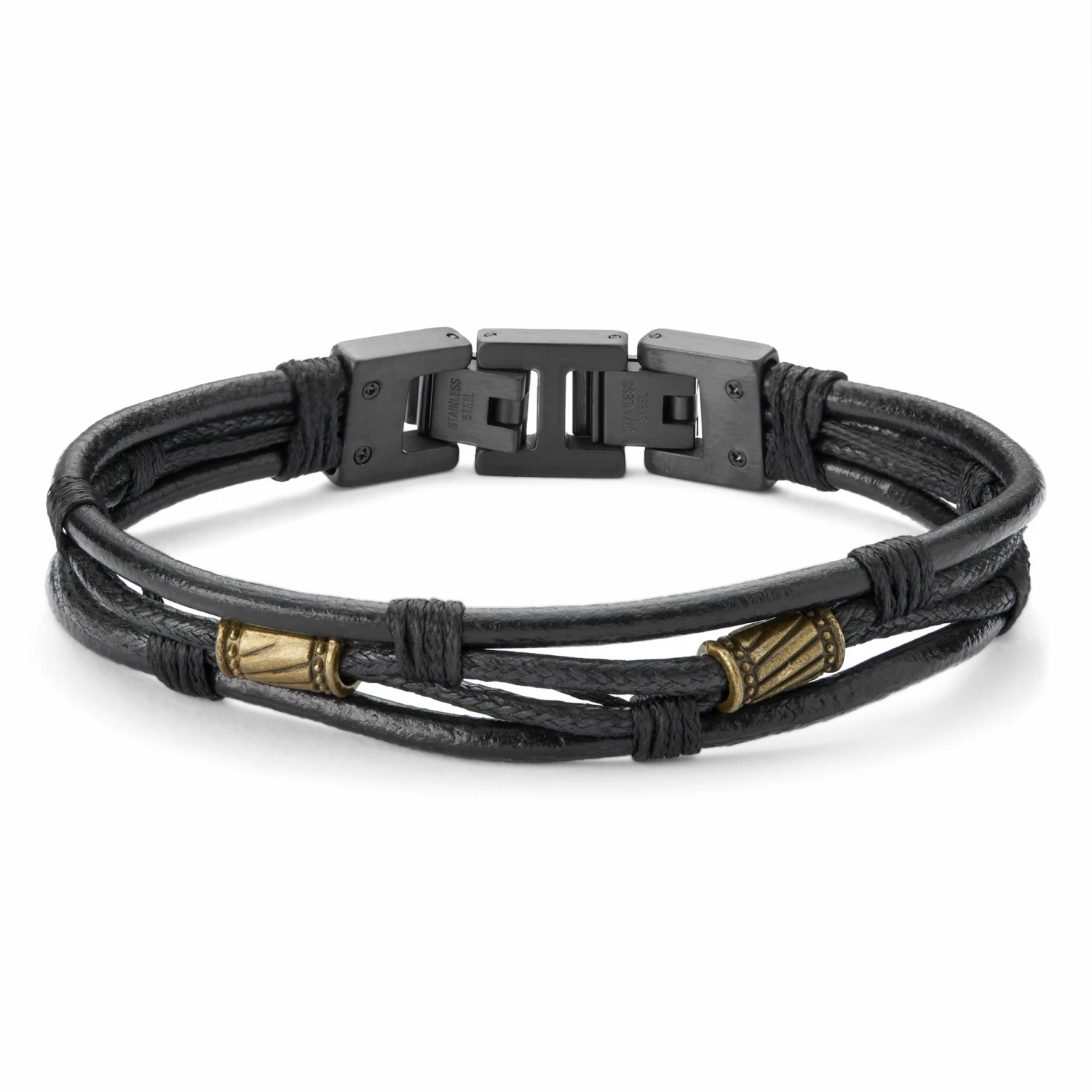 Black cords contrast with gold-tone stainless steel beads in an antique finish. The all-black stainless steel double lock is adjustable to fit most wrist sizes.