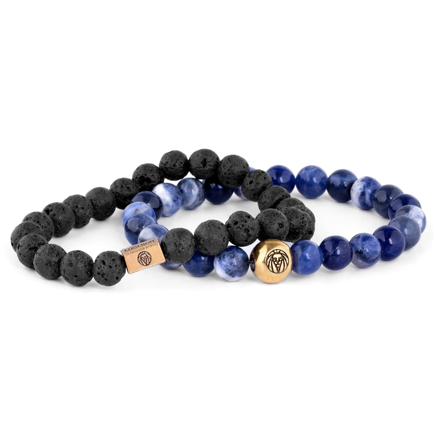 From the designers at Danish brand Lucleon. This coordinating duo of beaded bracelets features both cool, blue agate, and hot, matte black lava to create the perfect pair. Two gold-toned beads featuring Lucleon’s name and logo are included.