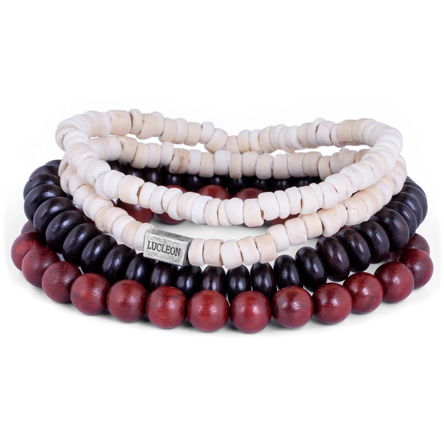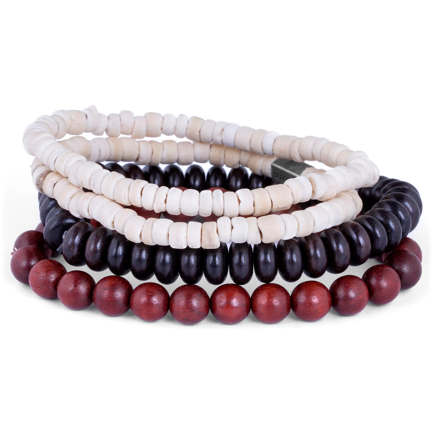 Crafted with natural wood and coconut beads. Features a single signature metal bead. Strung on strong silicone bands making them easy to put on and take off.