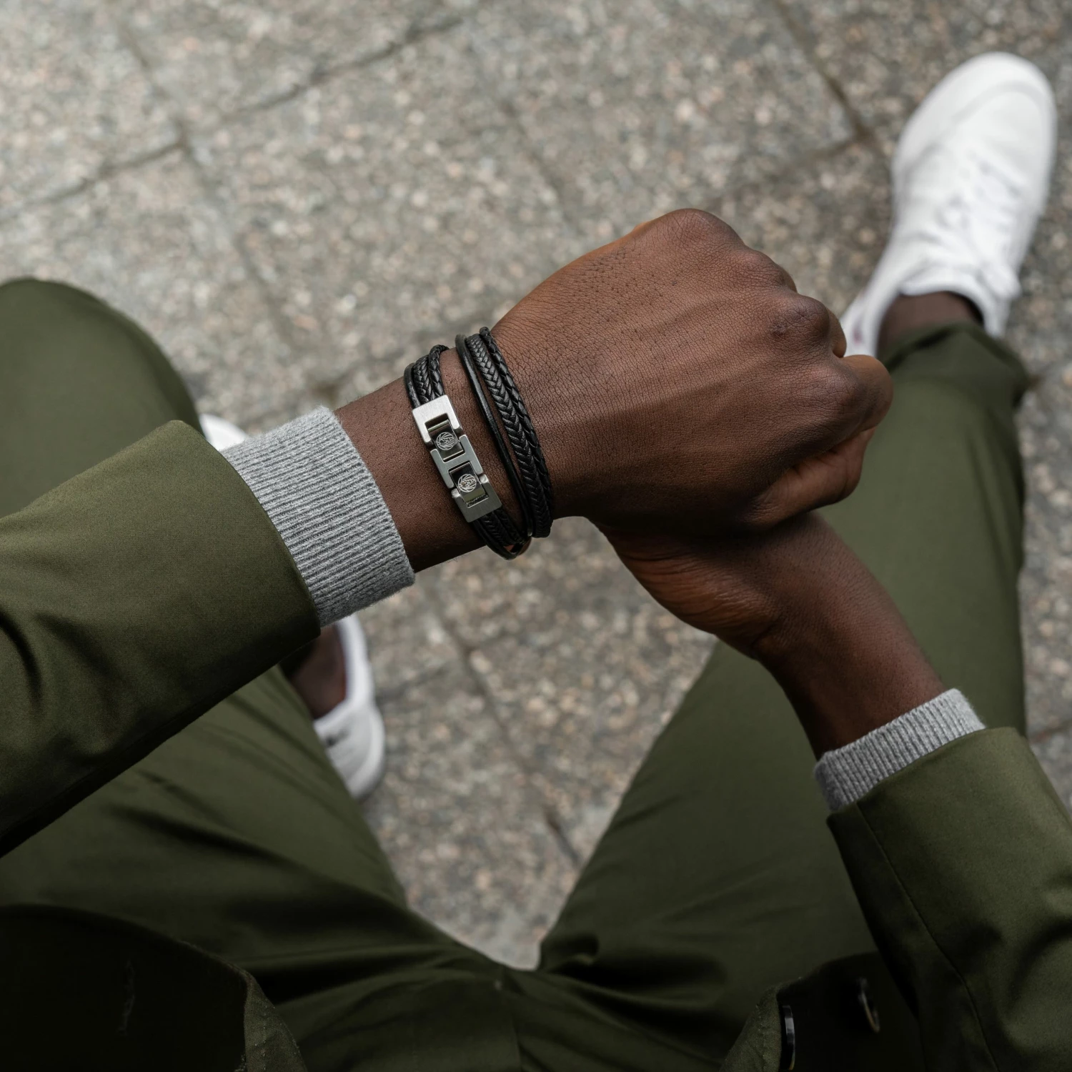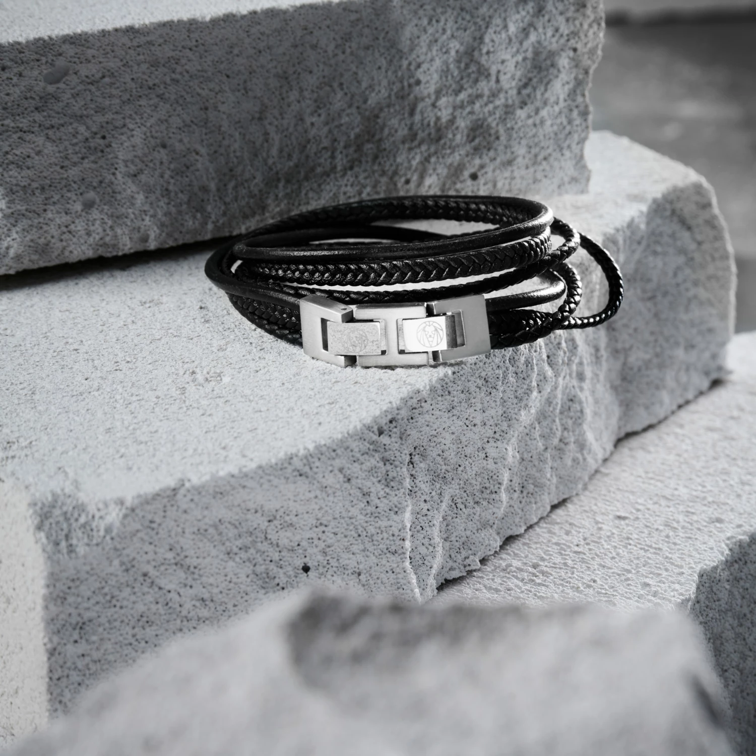 Braided cords are superfiber, all other strands are genuine black leather. Features a detachable double lock in strong stainless steel for easy fastening.