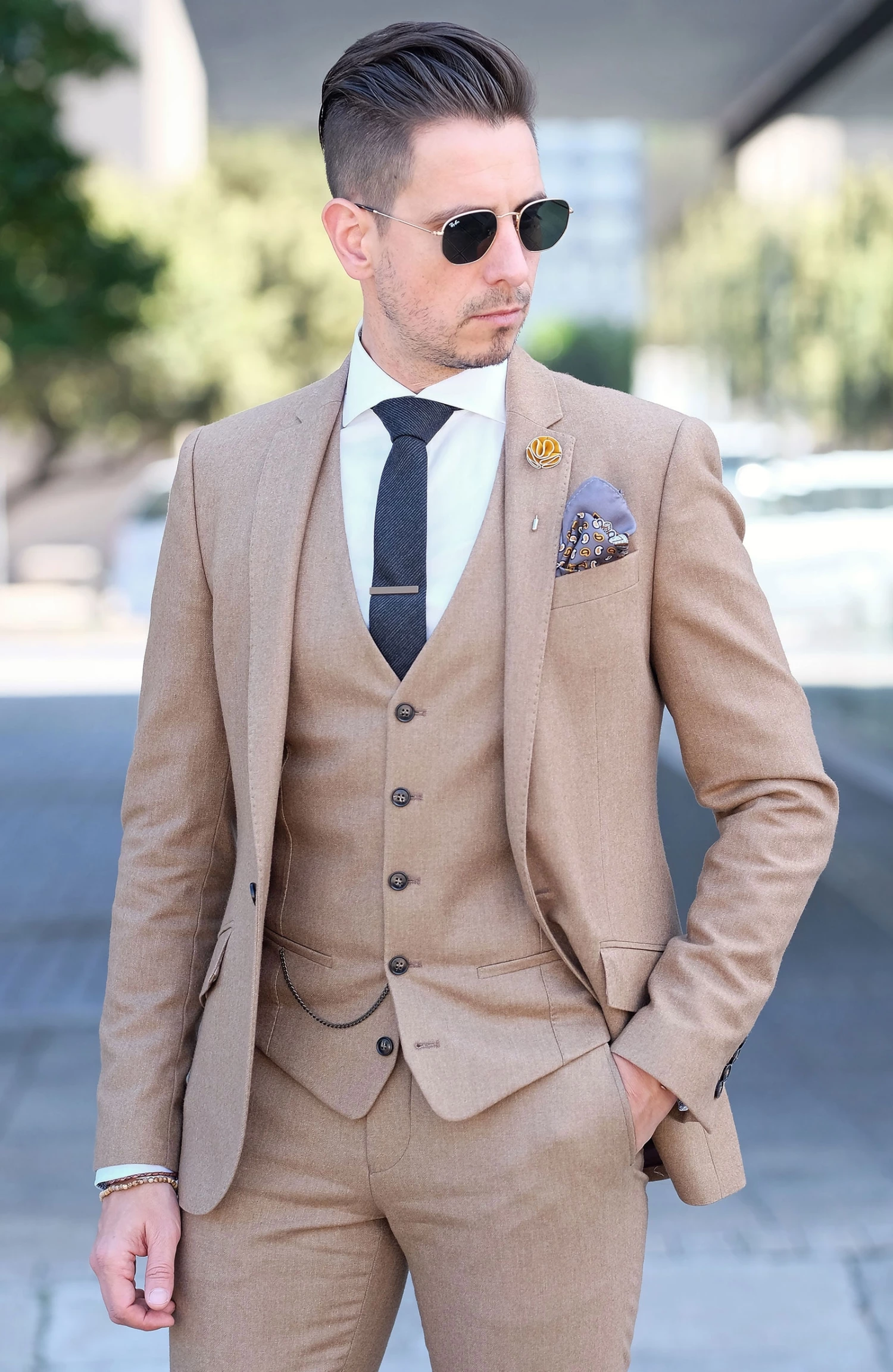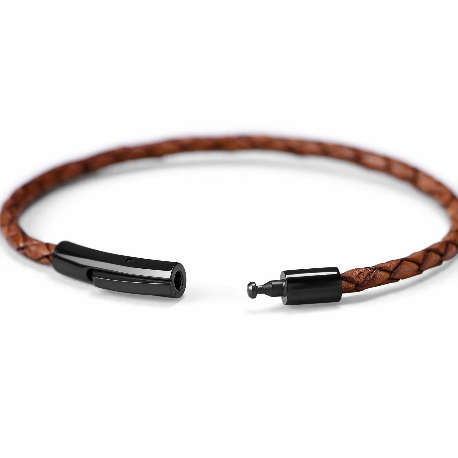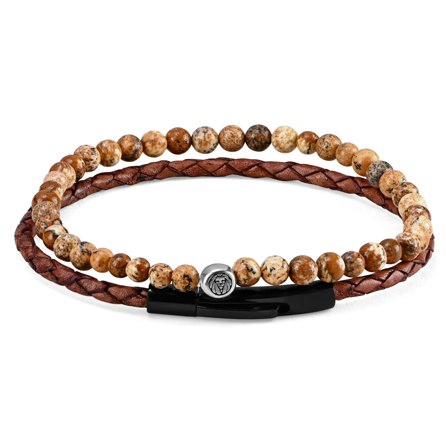 While it’d be a great piece on its own, this one comes paired with a tan leather woven bracelet as a complementary accessory with solid black stainless steel lock.