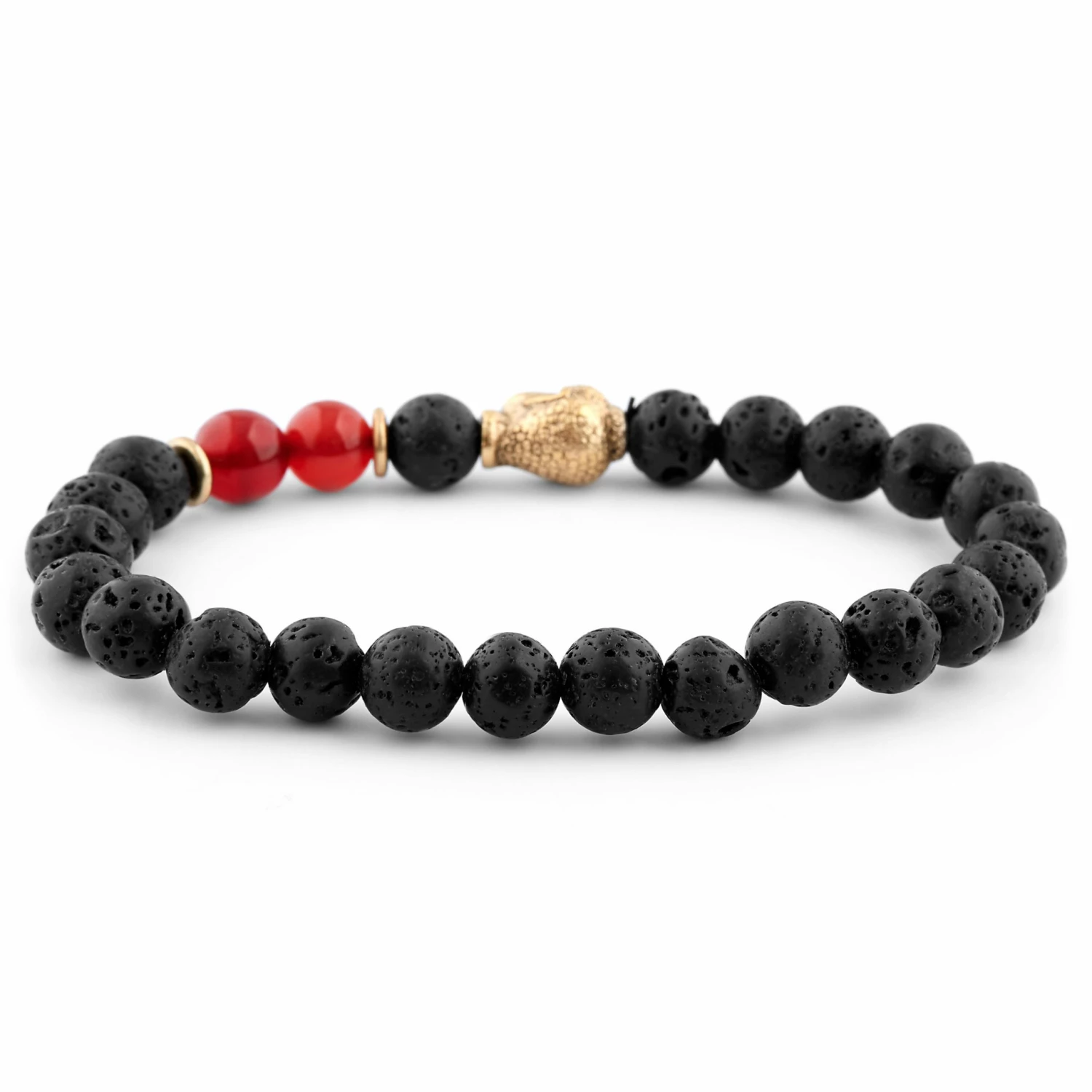 This fiery bracelet features red agate and smoldering black lava gemstones. An attractive combination that gives off a strong vibe of power and masculine energy.