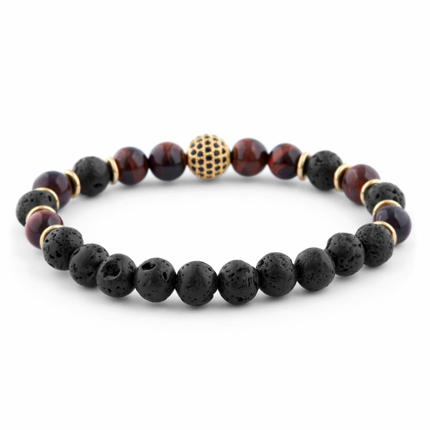 Beautiful gold colored metal intermingled with smoldering black lava and red tiger’s eye beads. This hot and fiery piece of wrist jewelry is styling yet oh so practical!