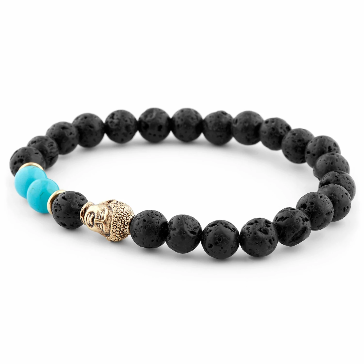 Matte black lava beads with uniquely textured surface complement the smooth blue turquoise. Strung through with a durable elastic band, the on and off procedure couldn’t be simpler. The gold colored metal Buddha adds a touch of mystic coolness.