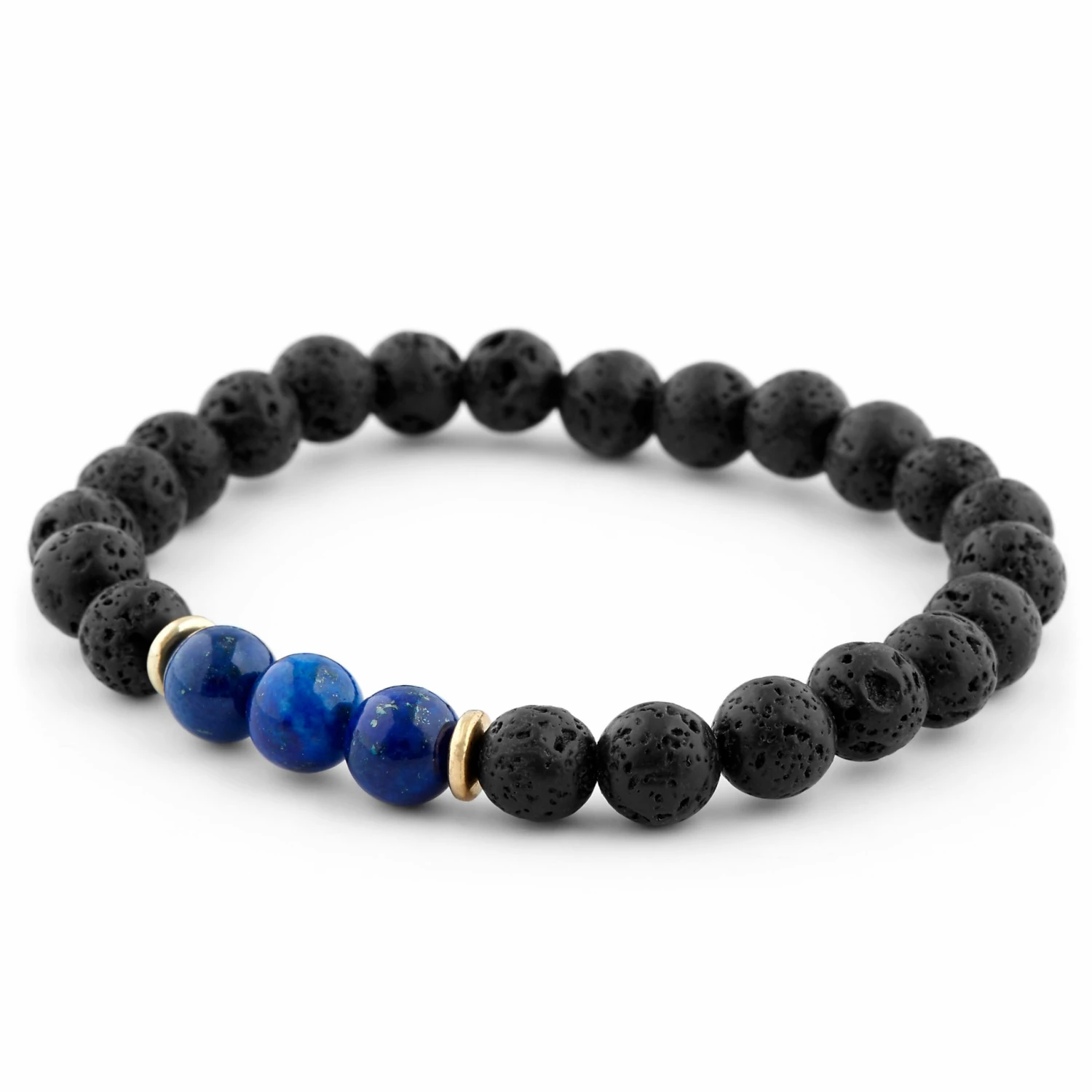 Step up your game with this hip beaded bracelet. A simple circle of black lava and lapis lazuli blue gemstones makes a magical combination.