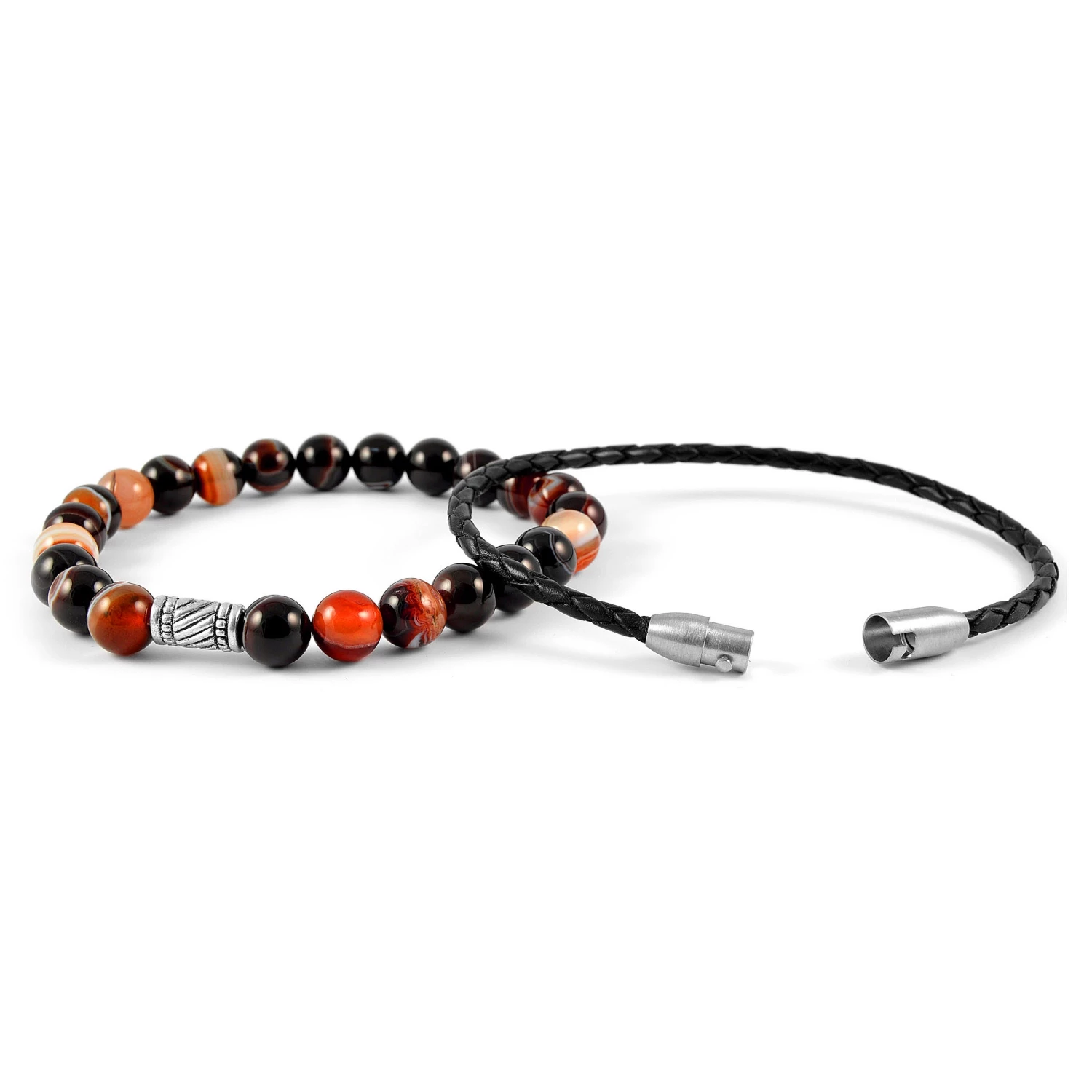 This set consists of two individual bracelets. The first is made with natural agate stone beads, threaded on a strong elastic band, and finished with a metal pendant. The second is braided black genuine leather with a stainless steel lock.