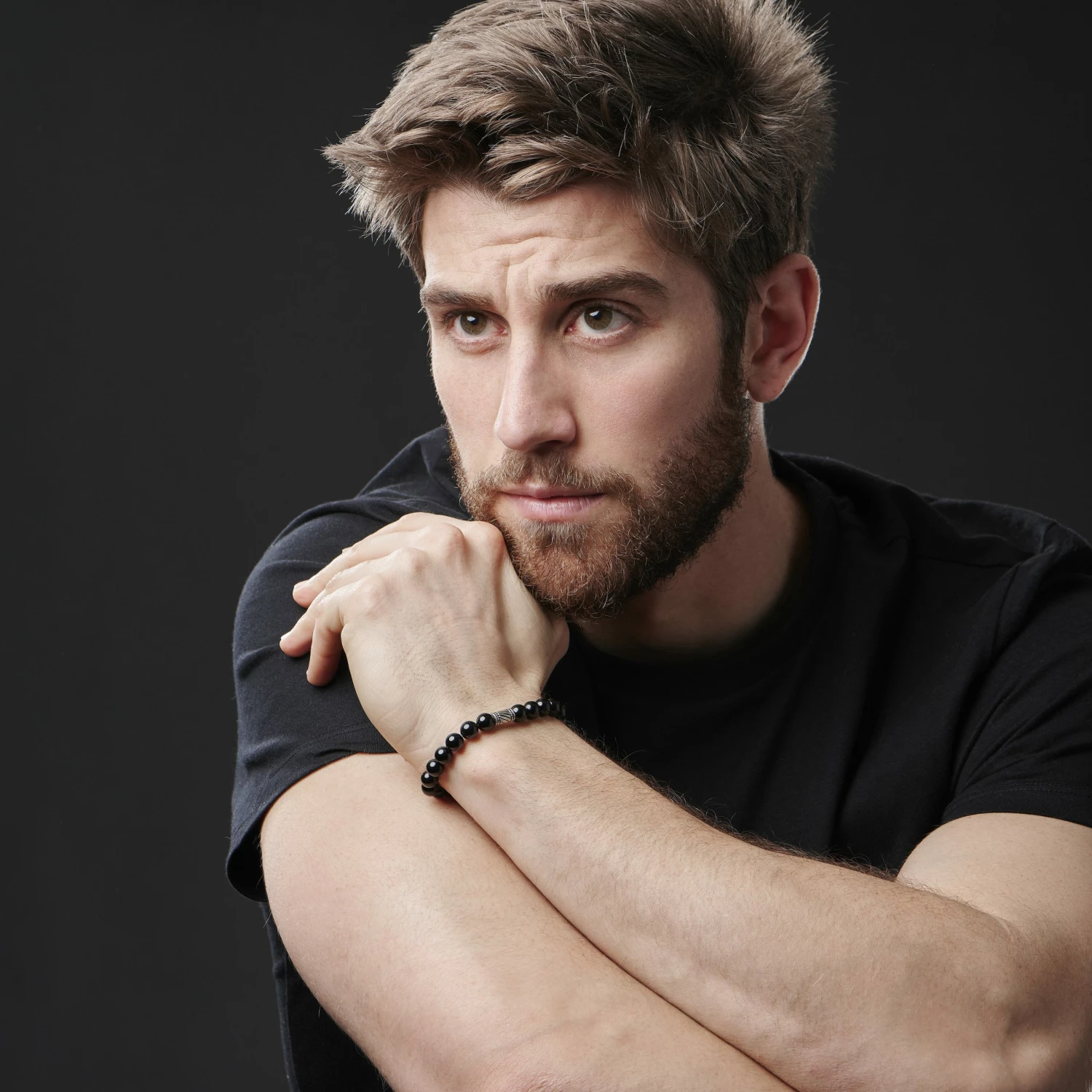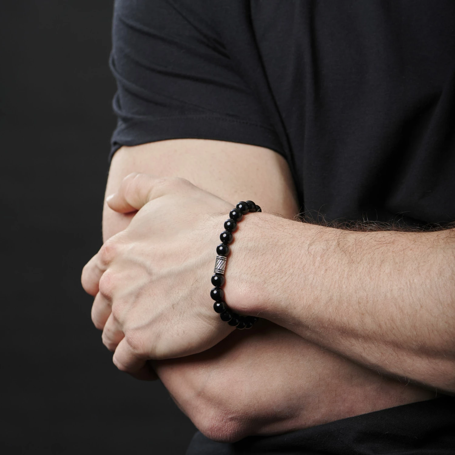 A real eye-catcher, the onyx beads emit a strong masculine energy. The single silver-colored metal bead makes an attractive feature.