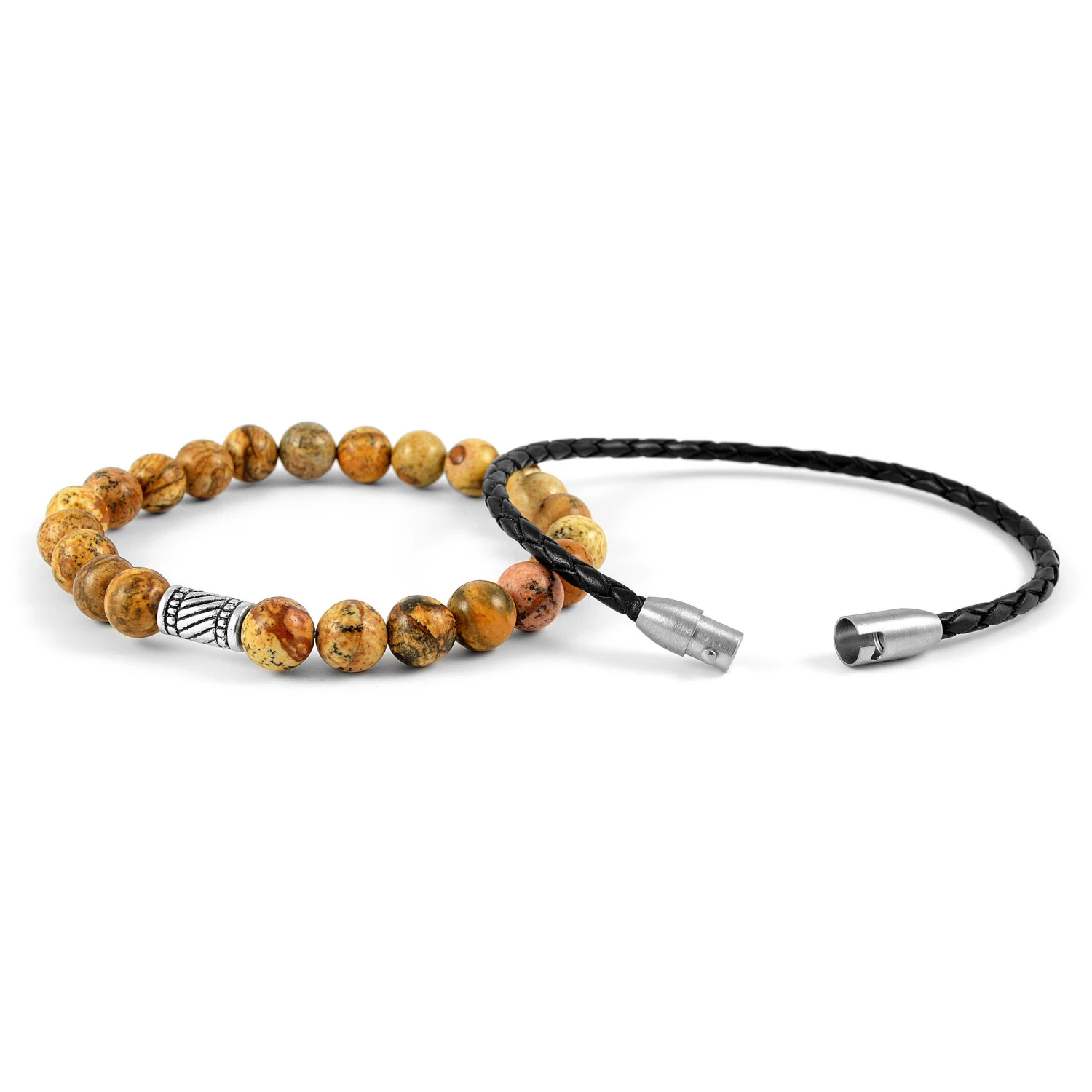 The simple black leather braid attaches securely with a polished silver-toned mag-lock clasp. The second bracelet features beautifully marbled stone beads on a strong silicone rubber band that simply slips on your wrist. Features a brushed prayer-wheel pendant. Comes in a beautiful Neshraw gift bag.