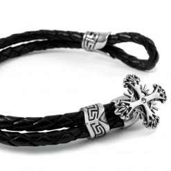 Fort Tempus Black Braided Leather Rope & Stainless Steel Cross Bracelet