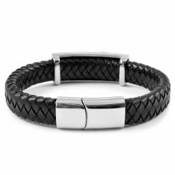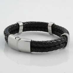 Fort Tempus Black Braided Leather Rope & Stainless Steel Double Bracelet