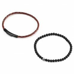 Lucleon Rusty Brown Leather & Matte Black Stone Bracelet Set