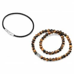 Neshraw Tiger’s Eye & Black Leather Bracelet Set