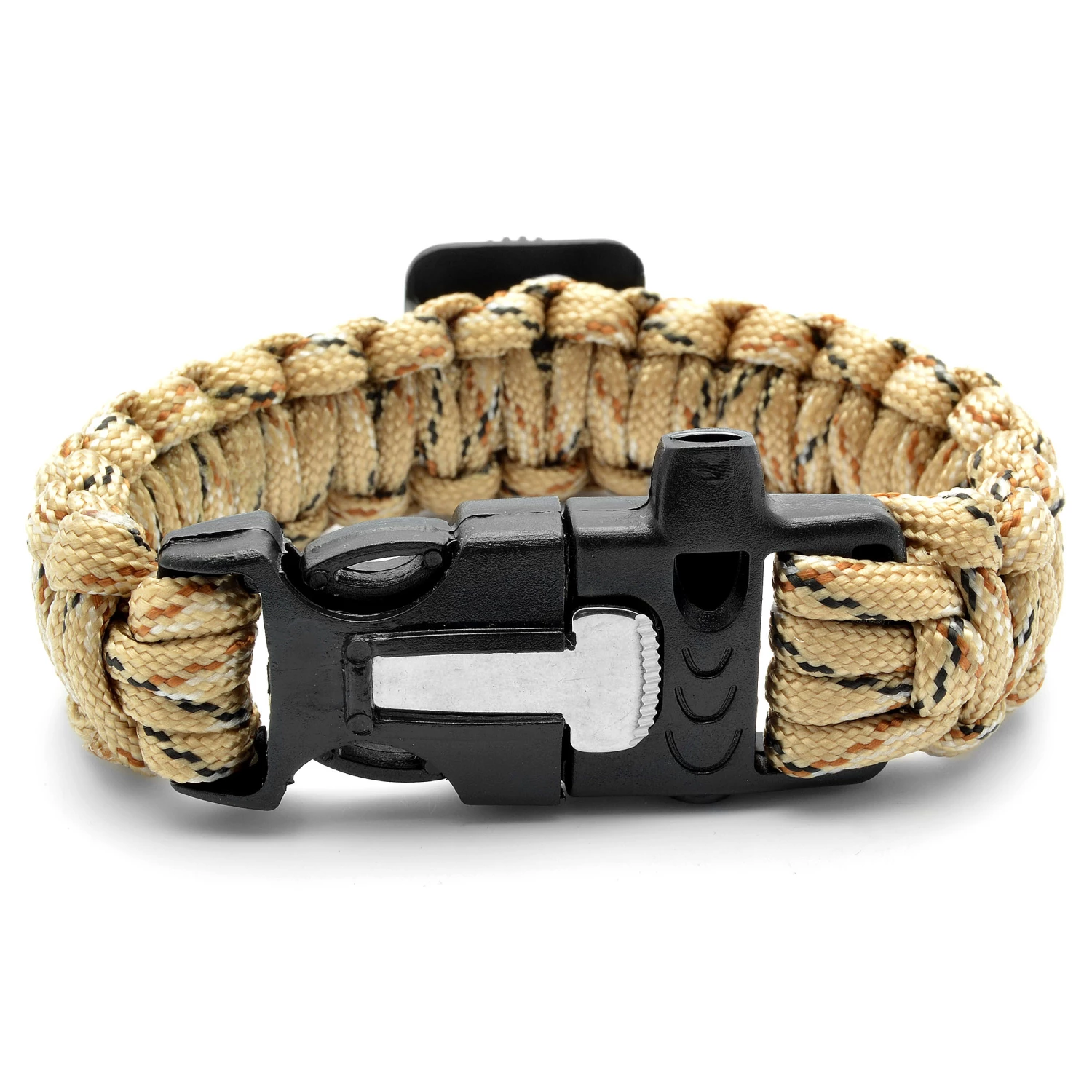 Comes equipped with a fully functional compass, whistle, and fire starter. Made of thin braided nylon cords, resulting in a very strong and durable bracelet. Sand camouflage color. Easy-to-use buckle. Comes in a great looking Trendhim bag.