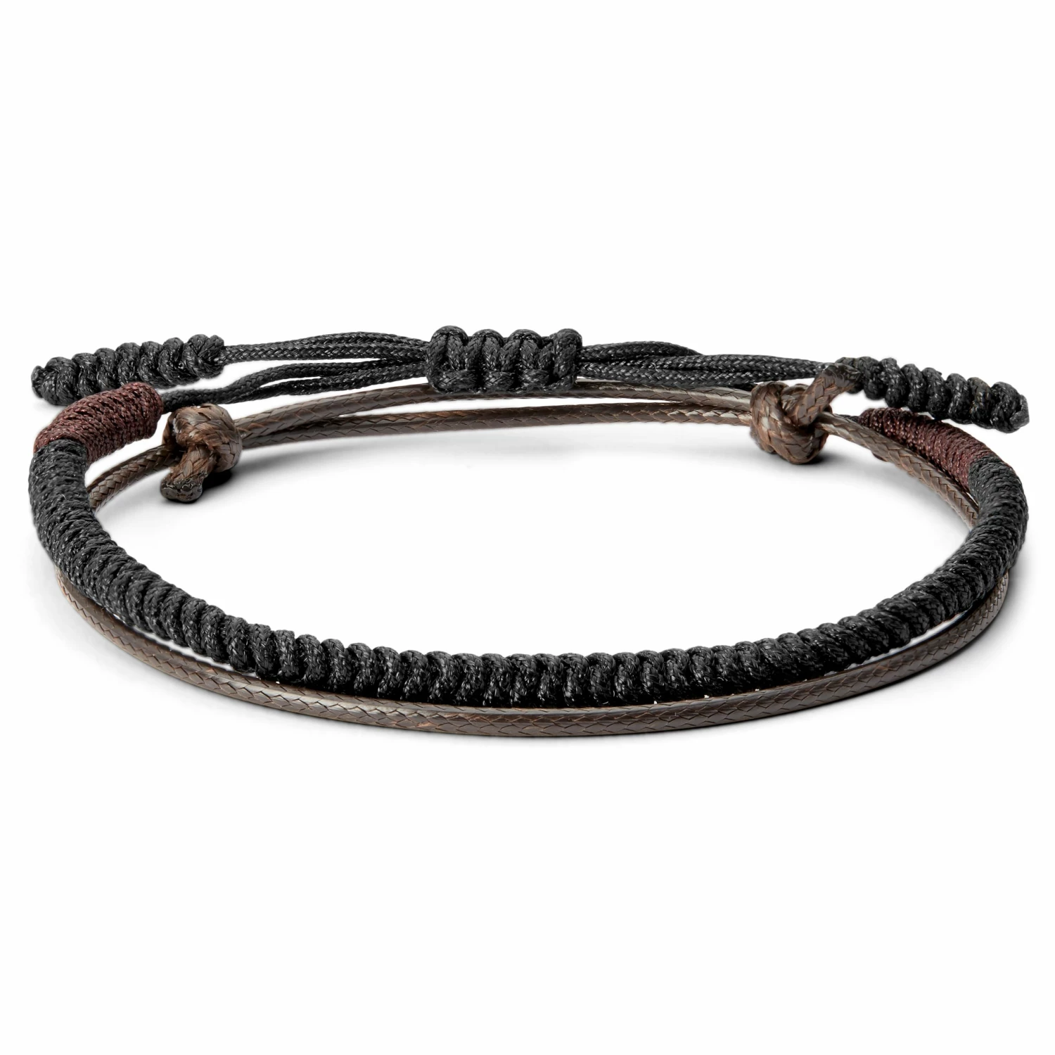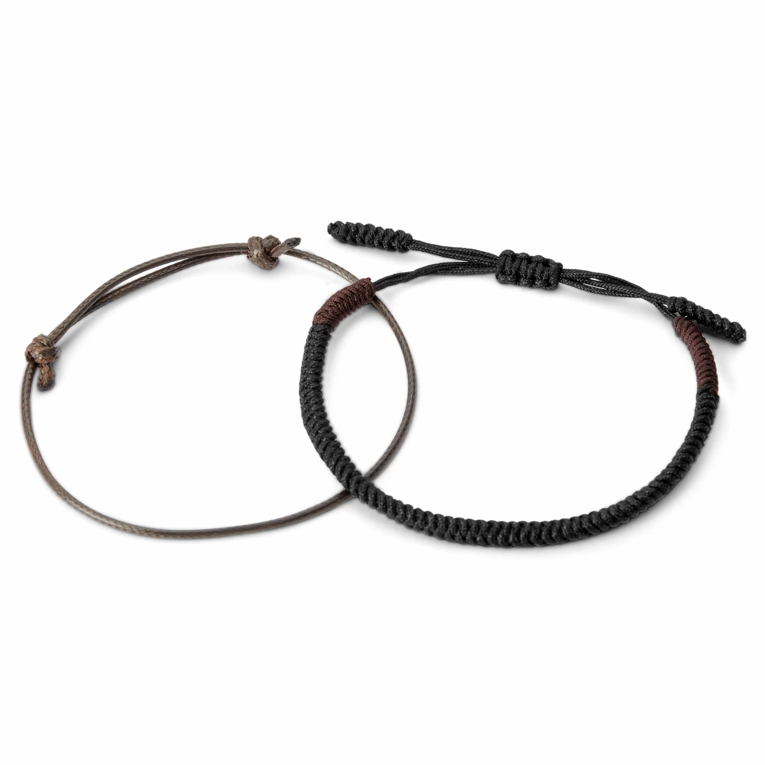 Black and brown are classically neutral colors that lend an air of sophistication to this casual set. This duo includes a Lucky Knot bracelet in black with brown ends and a brown braided bracelet. Inspired by Tibetan Buddhism, the Lucky Knot is said to bring good fortune to the wearer.
