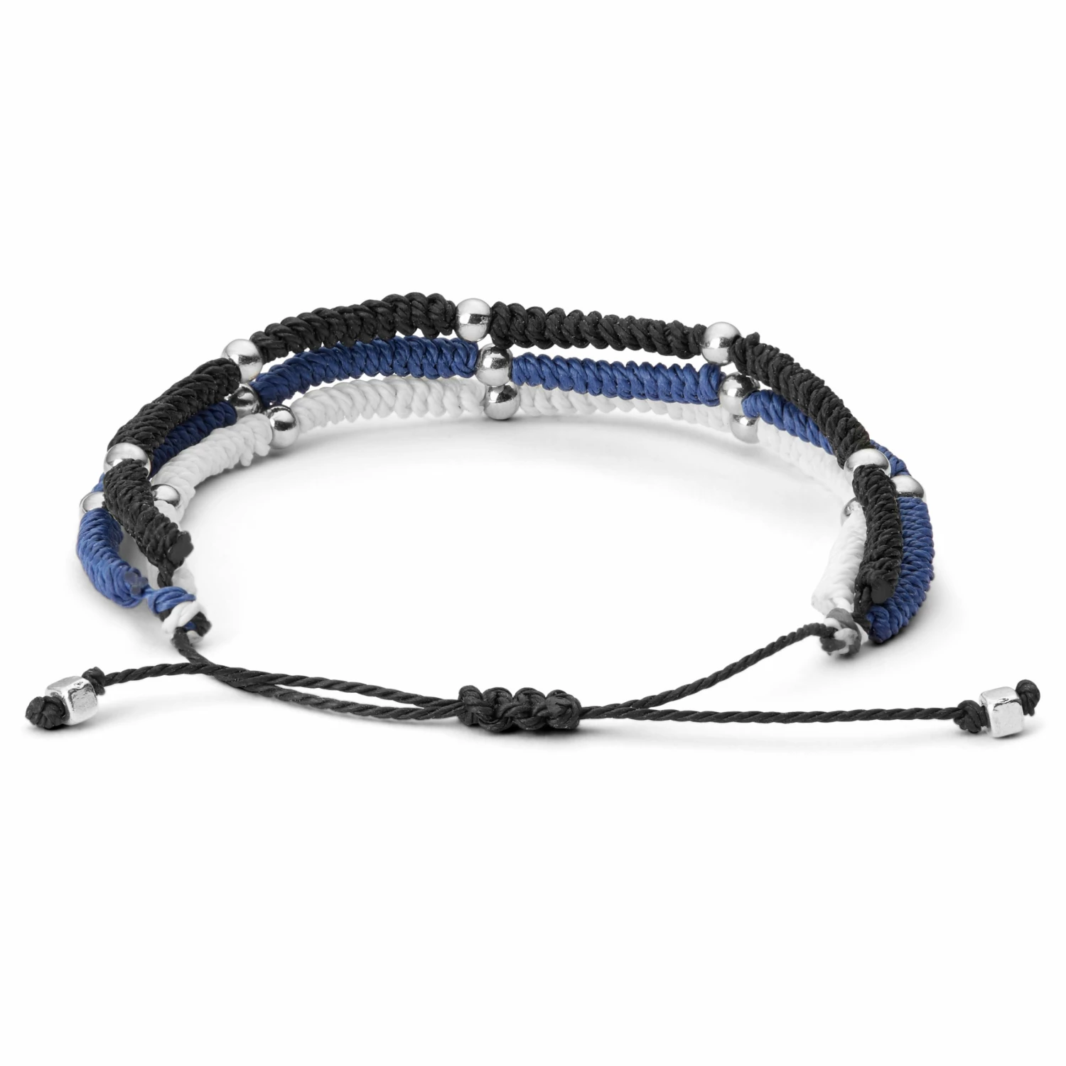 Made by hand and braided blue, white, and black with silver-tone metal beads. Features a sliding knot that’s easy to adjust for the right fit.