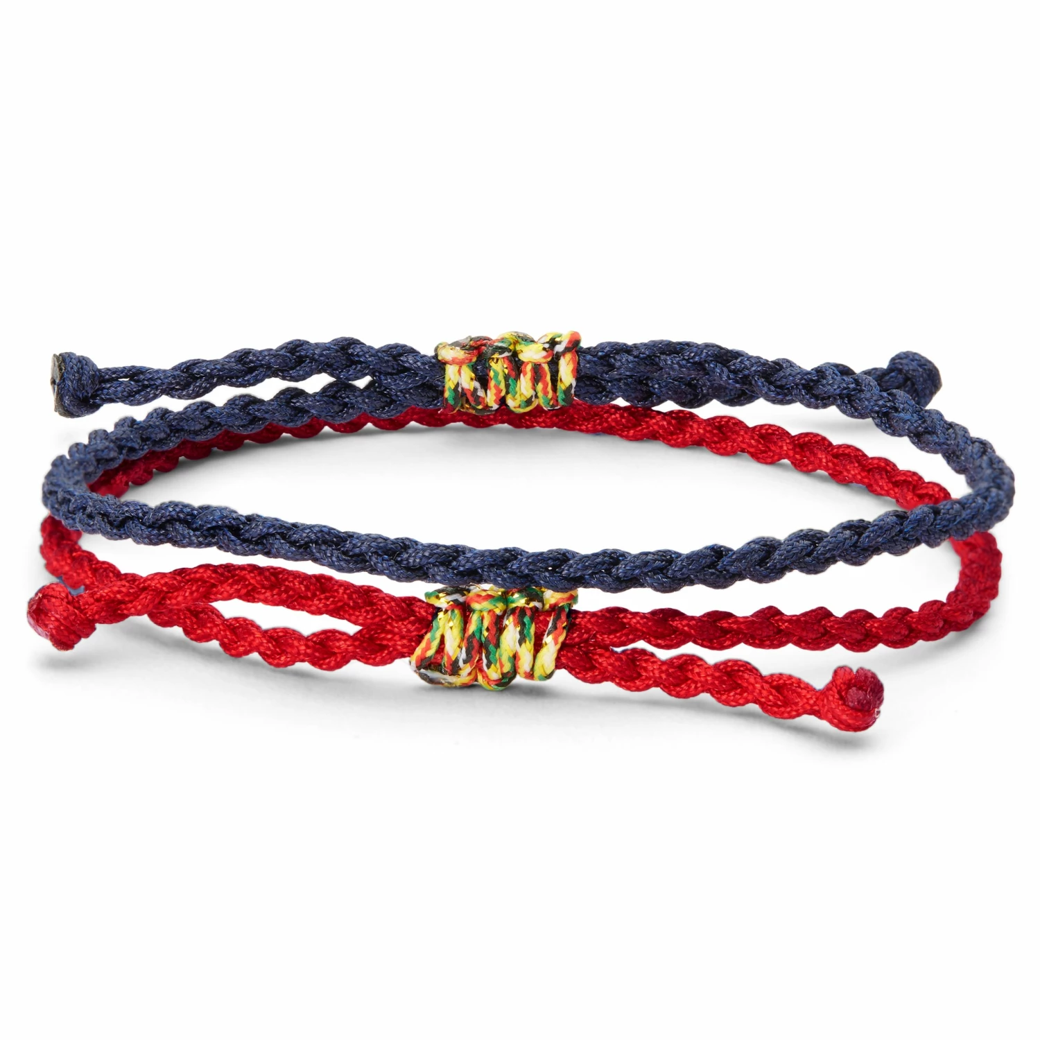 Features one dark-navy and one red bracelet.