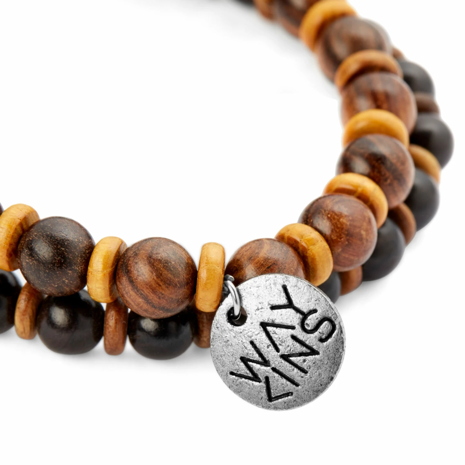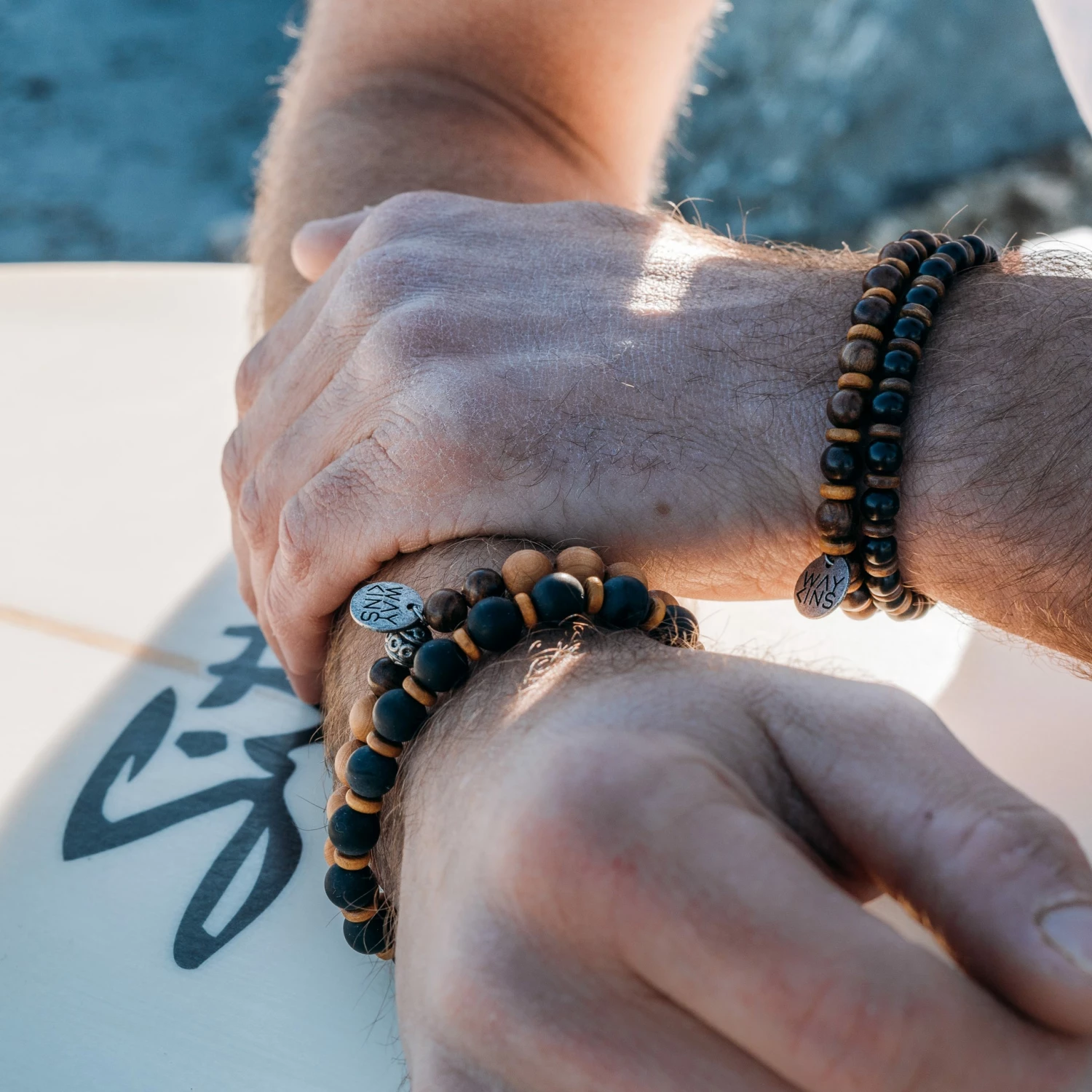 One bracelet features natural-colored beads with a metal Waykins tag, while the other boasts smaller dark beads. The set can be worn together or separately and comes with a gift pouch.